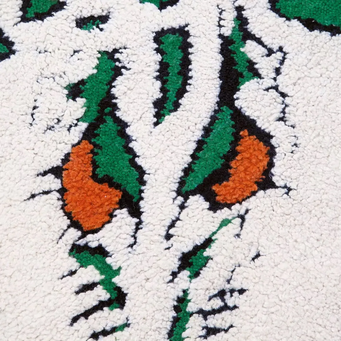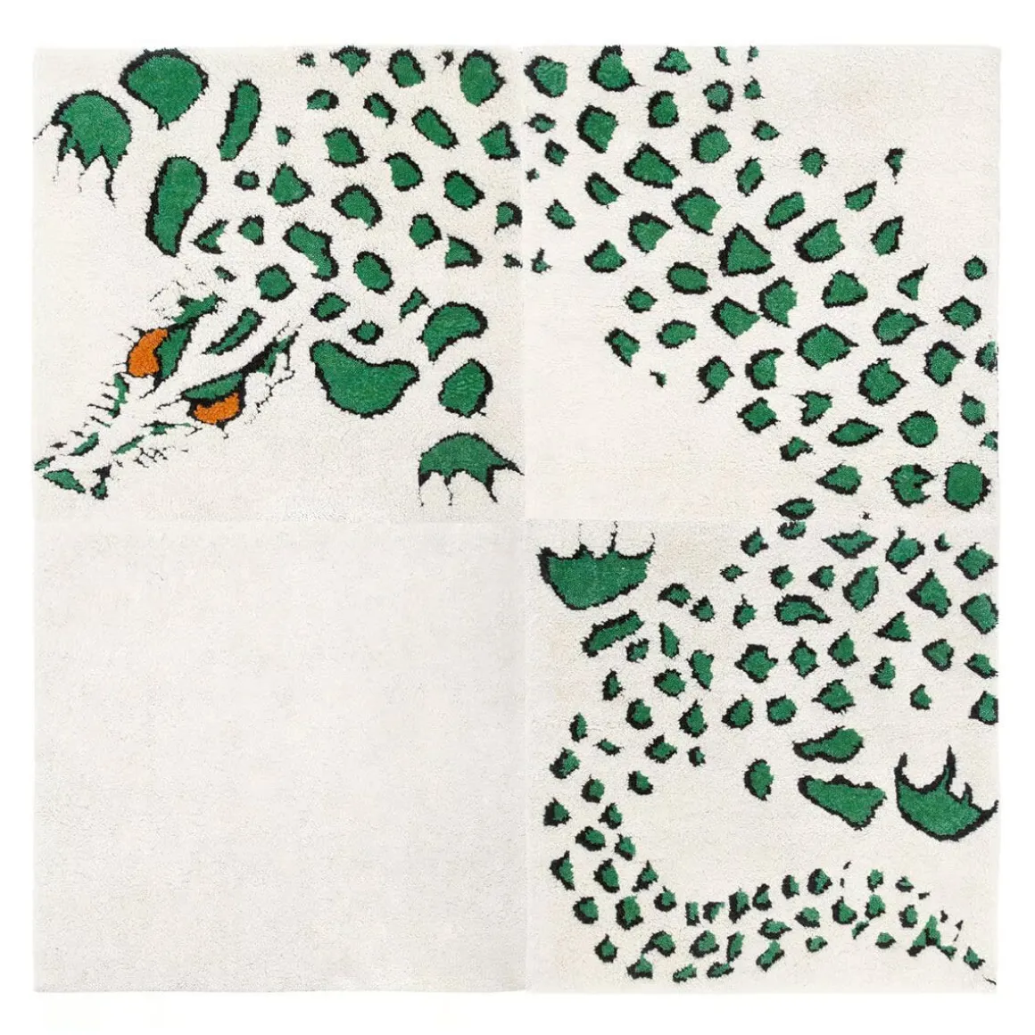 Tapidrago de Amini par Roberto Gabetti et Aimaro Isola. Créés à l’origine sur un métier semi-mécanique, les tapis en pure laine revisités par Amini sont noués à la main et présentent un velours sculpté à deux niveaux. La collection se caractérise par quatre motifs animaliers différents : le léopard, Tapipardo, orange sur fond bleu ; le lion, Tapileo, ocre sur fond jaune ; l’ours, Tapiorso, blanc sur fond ivoire ; et le dragon, Tapidrago, vert sur fond blanc. Ce dernier, différent des autres, est divisé en quatre parties égales et peut être assemblé selon les besoins : comme un tapis de couloir pour embellir une entrée ou un couloir, ou comme un tapis, parfait pour tout espace de vie.