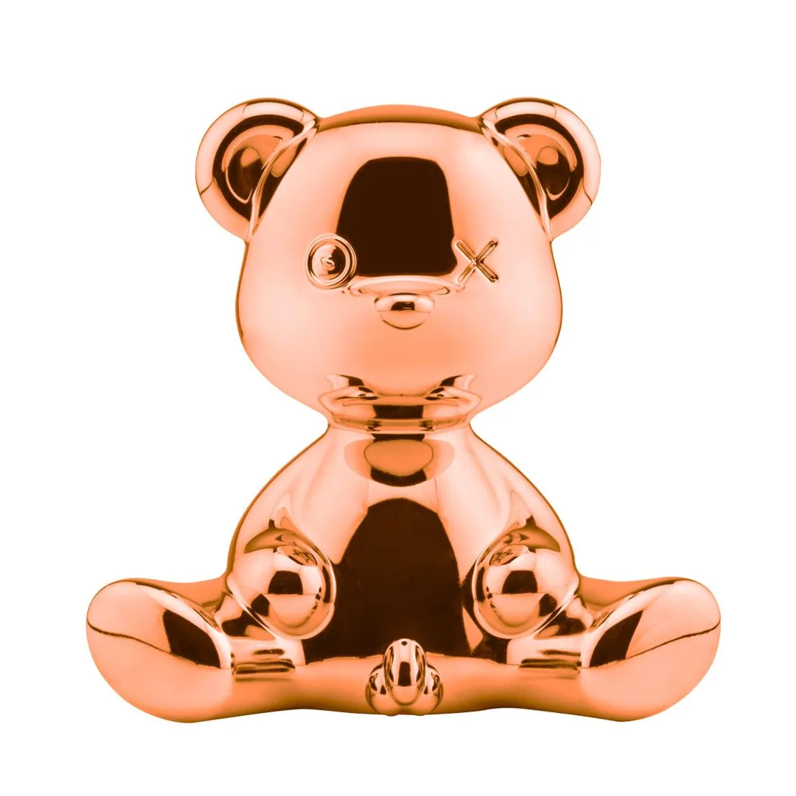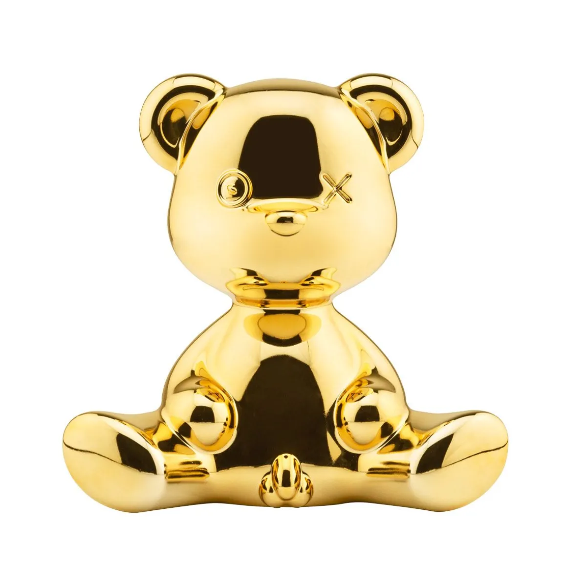 Teddy boy de Qeeboo. Conçue par Stefano Giovannoni à la manière d’un ours en peluche original, Teddy Boy est une lampe de table qui fait un clin d’œil au jouet traditionnel avec une attitude irrévérencieuse mêlant les traits de l’ours en peluche à des caractéristiques « presque humaines ». Il présente un revêtement métallique spécial qui enrichit la surface sans interférer avec la lumière. Irritant et glamour, c’est le prochain article de la liste de souhaits de tous les accros du design.