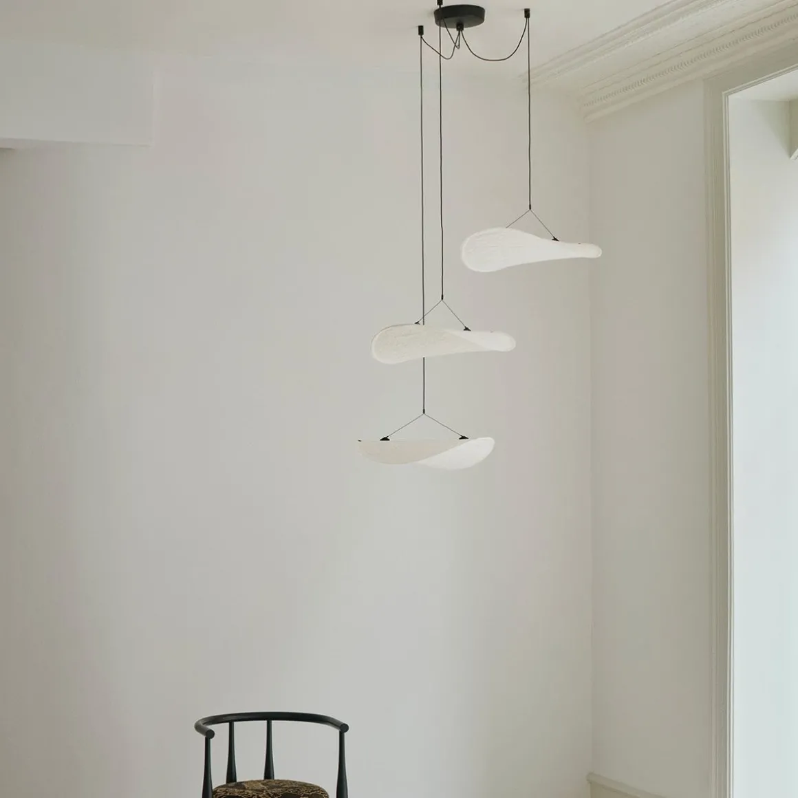 Tense Chandelier de New Works par Panter & Tourron. Dans une formation composée de trois abat-jour plus petits, chacun d’un diamètre de ø55 cm, le lustre Tense crée une alternative sophistiquée au lustre classique. Trois écrans apparaissent dans une constellation unie, fusionnant en une expression unie, volumineuse mais légère. Reflétant la marque de fabrique de la série Tense, ces abat-jour, fabriqués en Tyvek, diffusent une douce luminance du haut et du bas.