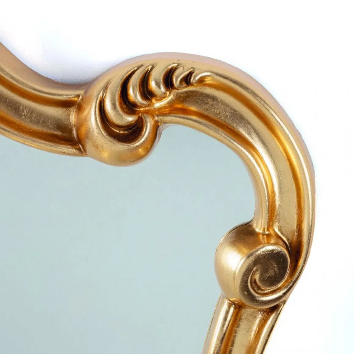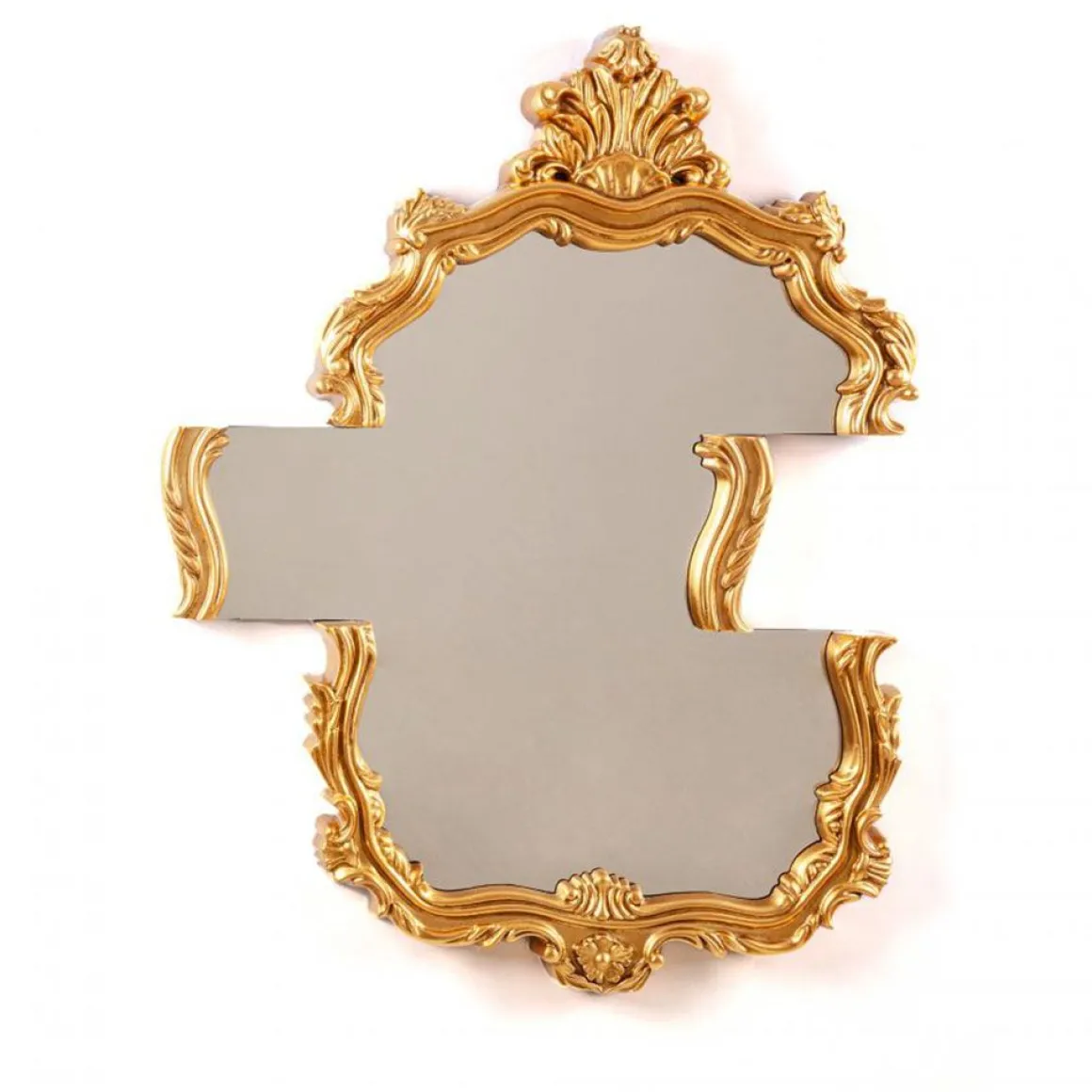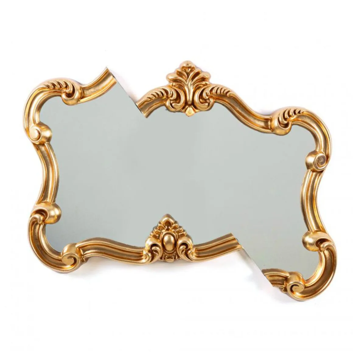 Formes traditionnelles réinterprétées avec originalité. Le cadre doré du miroir se décompose donnant naissance à une surface aux niveaux coplanaires résultant d’une translation impossible. Le miroir semble être en mouvement, comme par magie.