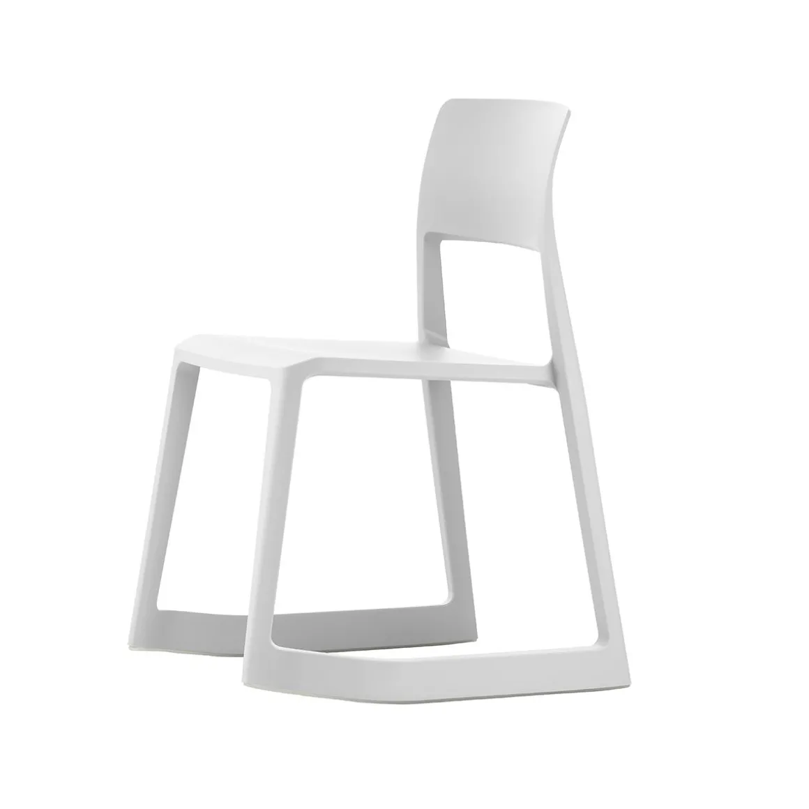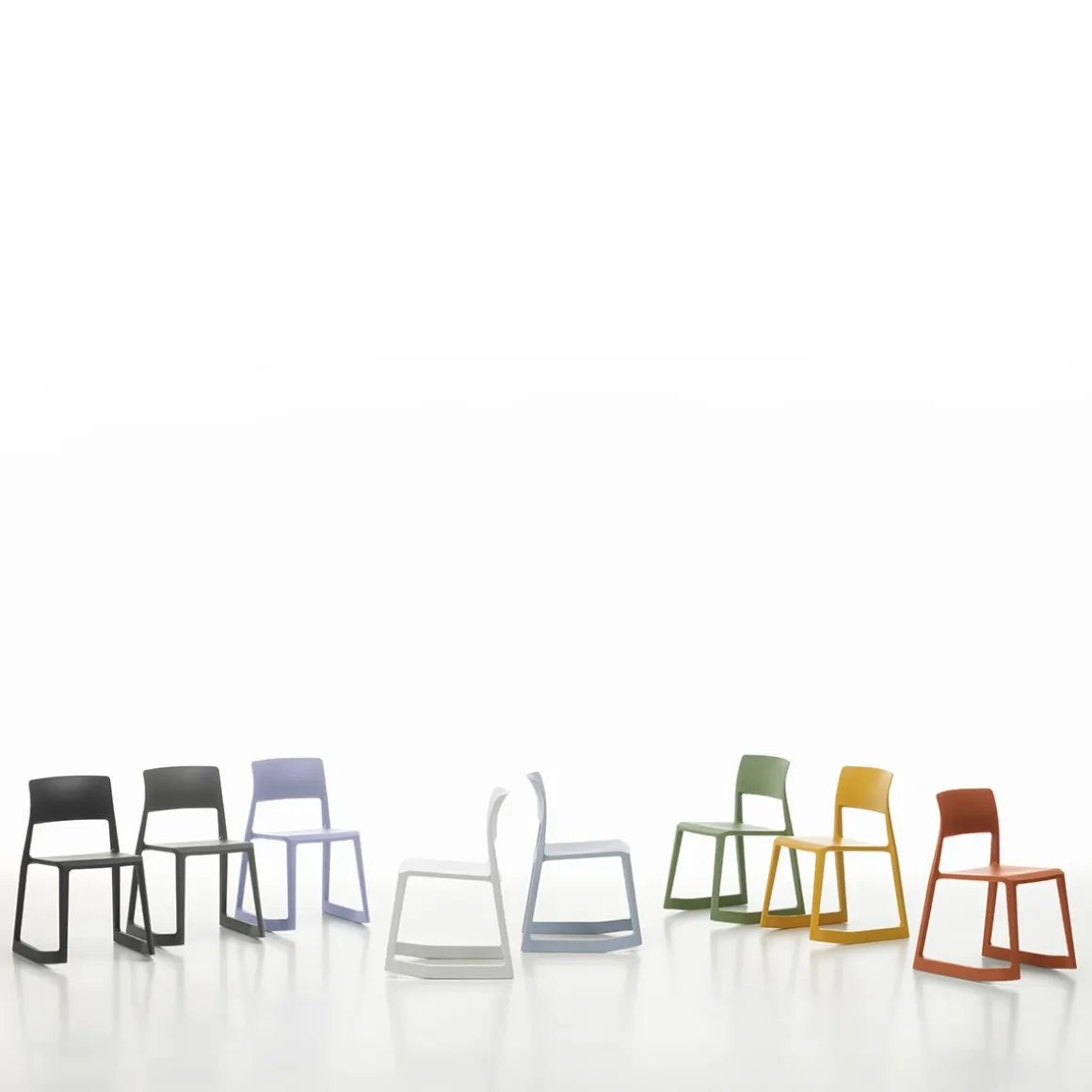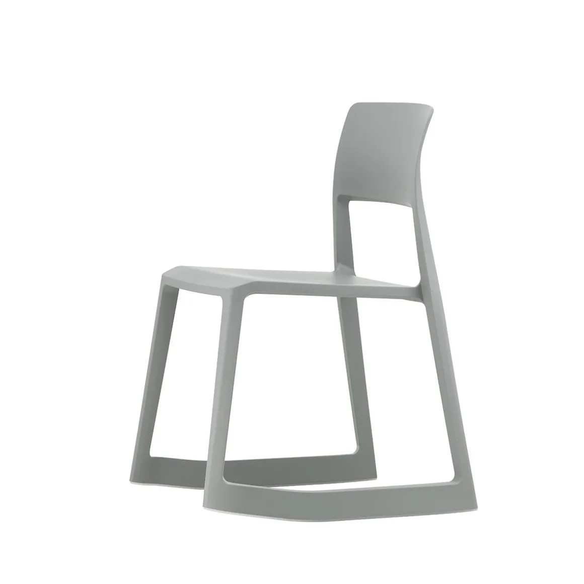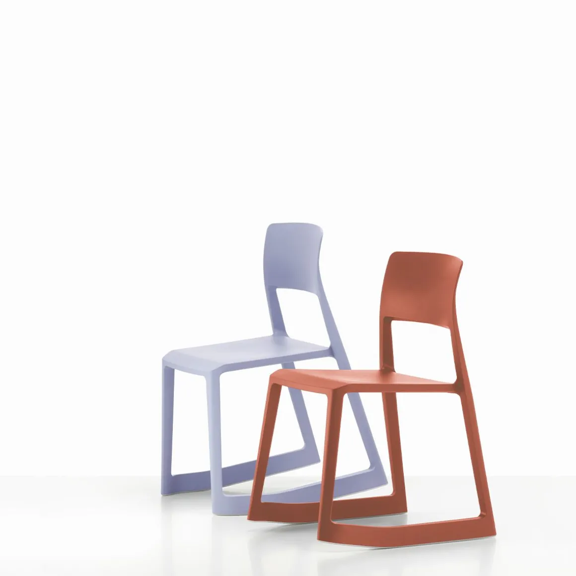 Le siège tout en plastique Tip Ton peut être incliné de quelques degrés vers l’avant par rapport à la position normale. Cette position redresse le bassin et la colonne vertébrale, améliorant ainsi la circulation sanguine dans les muscles abdominaux et dorsaux. En 2020, Vitra a développé une version du siège fabriquée à partir de plastique recyclé : Tip Ton RE. Le matériau de recyclage de haute qualité provient de déchets ménagers recyclés, en particulier des emballages usagés. L’utilisation de cette matière première à la place des plastiques primaires à base de pétrole signifie une réduction de 54% d’émissions novices pour le climat, allant de pair avec un baisse significative de la consommation d’énergie primaire. Pour obtenir la stabilité et la qualité requises, une certaine proportion de fibres de verre est ajoutée au matériau de recyclage. La teinte gris foncé de Tip Ton RE est la teinte naturel du matériau de recyclage traité, présentant de très légères irrégularités de couleur.