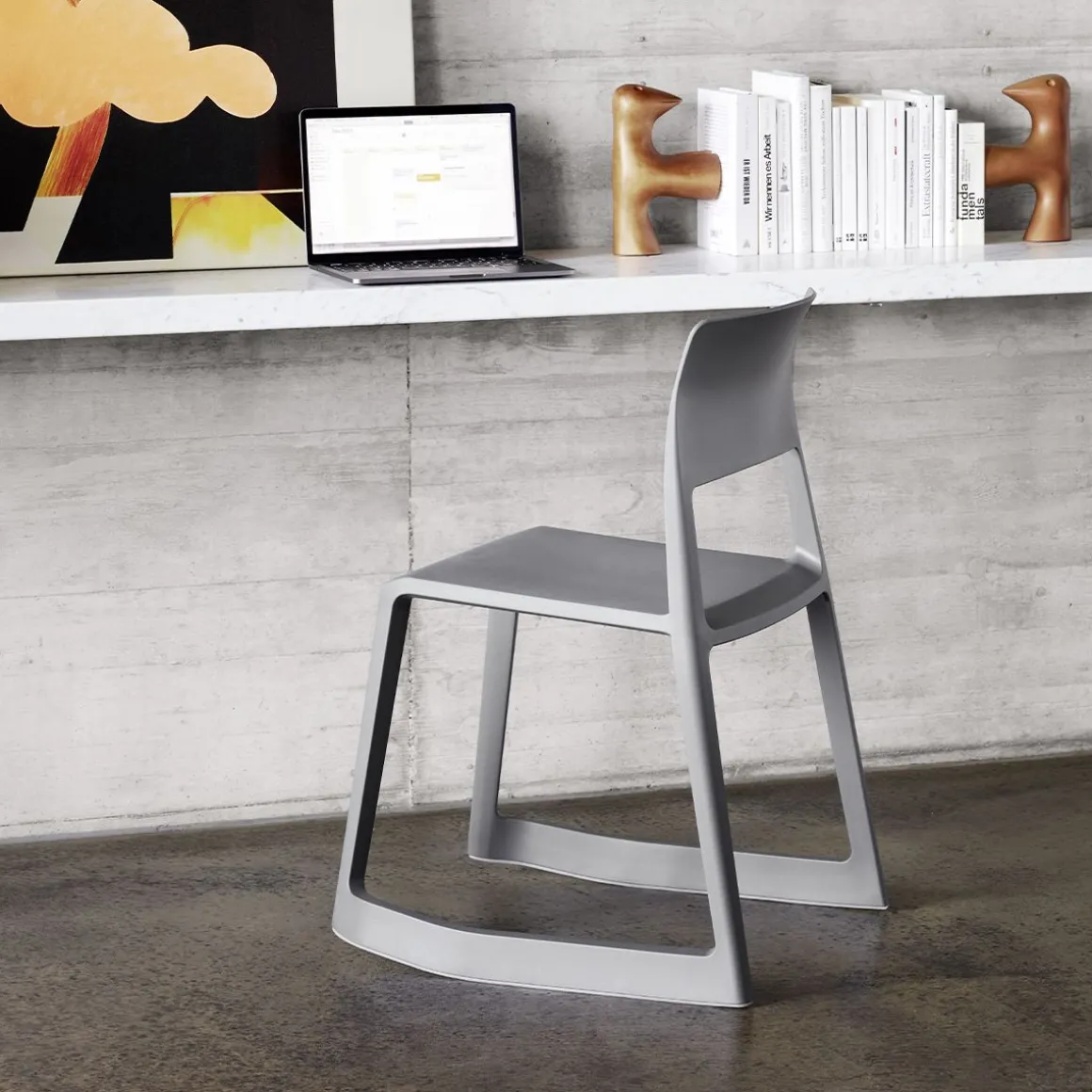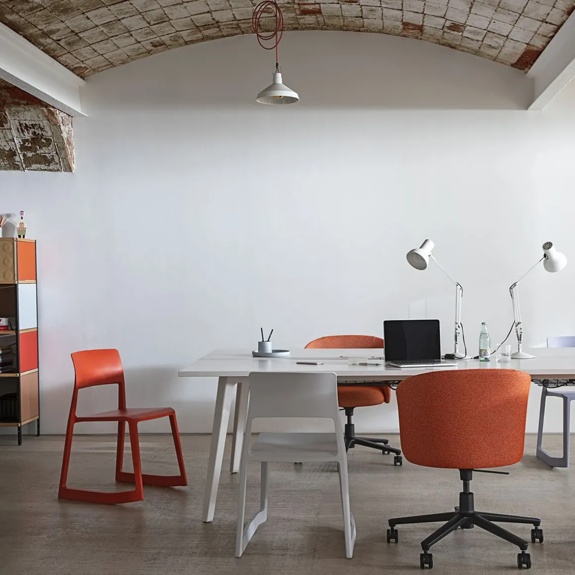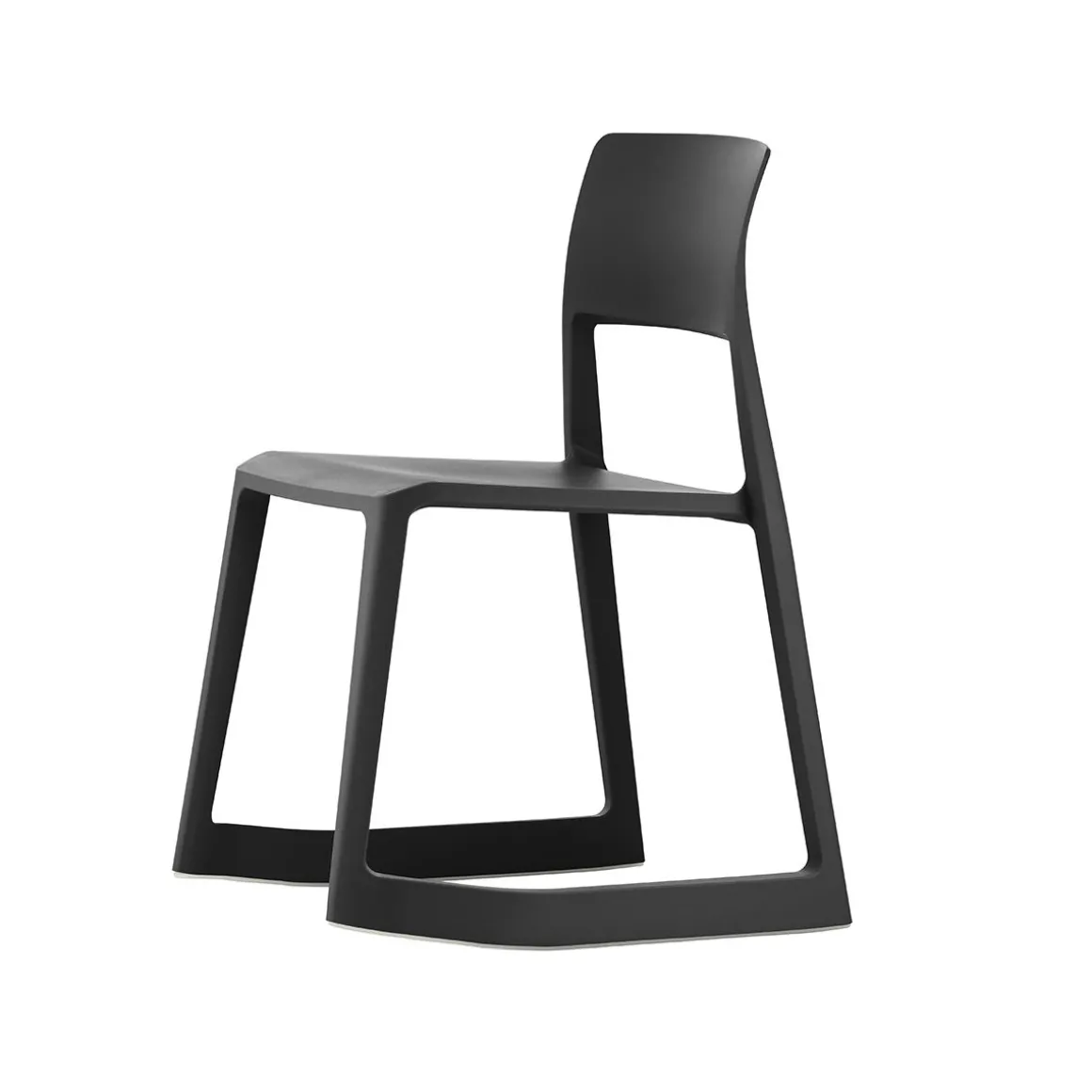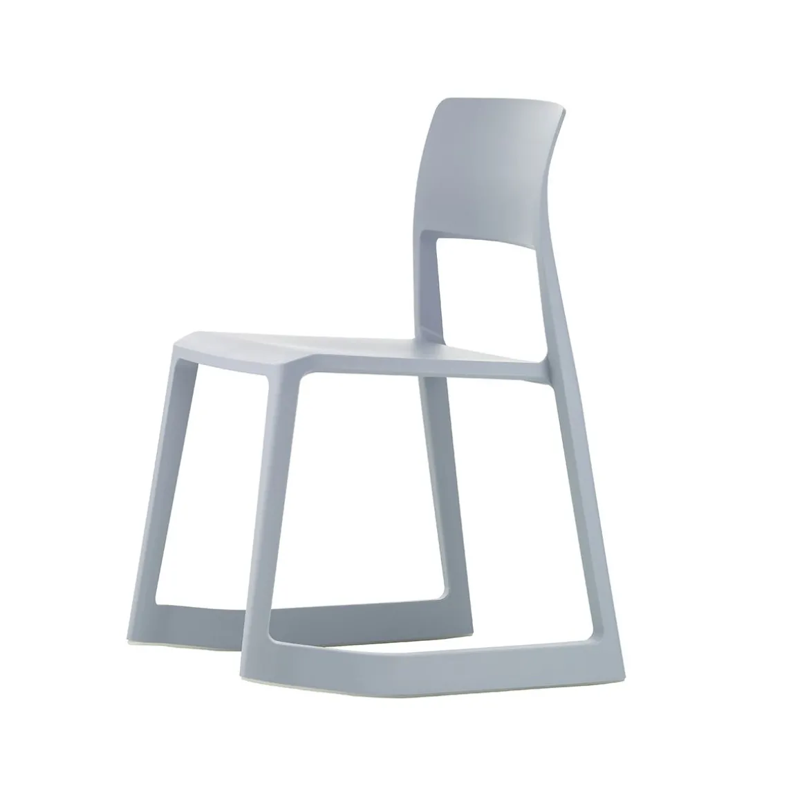 Le siège tout en plastique Tip Ton peut être incliné de quelques degrés vers l’avant par rapport à la position normale. Cette position redresse le bassin et la colonne vertébrale, améliorant ainsi la circulation sanguine dans les muscles abdominaux et dorsaux. En 2020, Vitra a développé une version du siège fabriquée à partir de plastique recyclé : Tip Ton RE. Le matériau de recyclage de haute qualité provient de déchets ménagers recyclés, en particulier des emballages usagés. L’utilisation de cette matière première à la place des plastiques primaires à base de pétrole signifie une réduction de 54% d’émissions novices pour le climat, allant de pair avec un baisse significative de la consommation d’énergie primaire. Pour obtenir la stabilité et la qualité requises, une certaine proportion de fibres de verre est ajoutée au matériau de recyclage. La teinte gris foncé de Tip Ton RE est la teinte naturel du matériau de recyclage traité, présentant de très légères irrégularités de couleur.