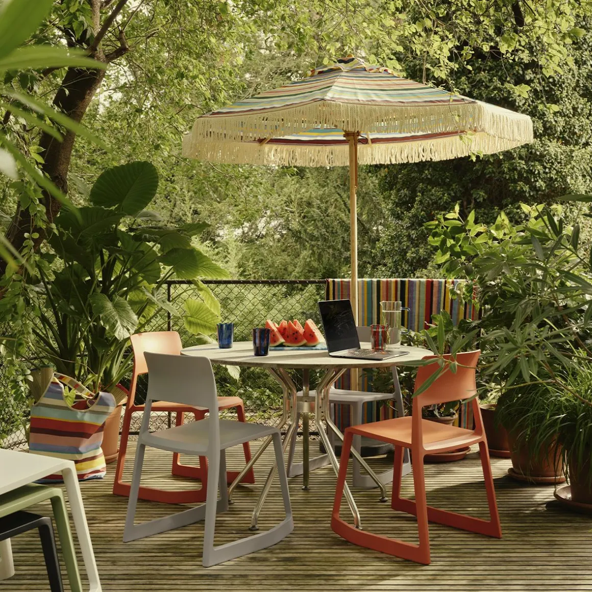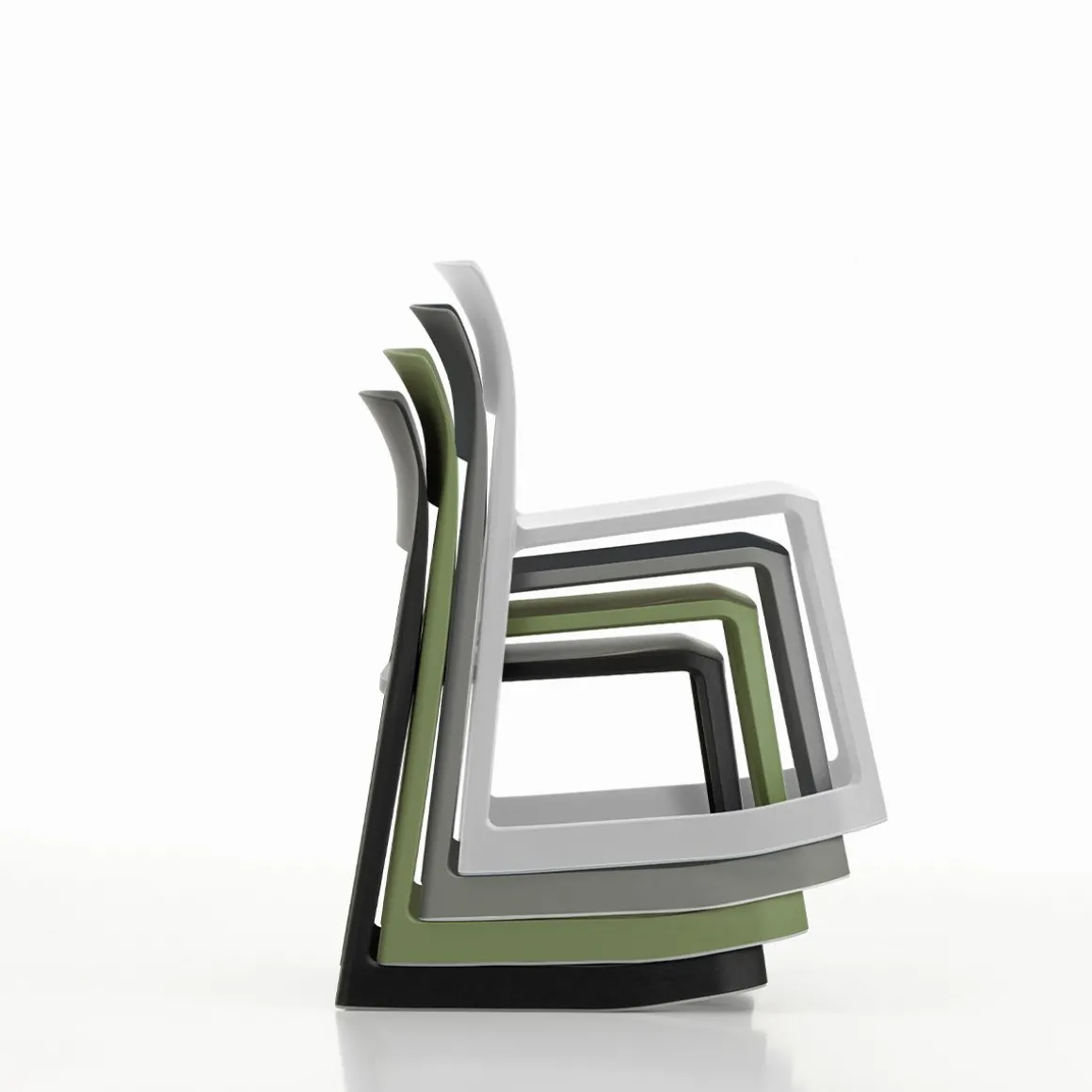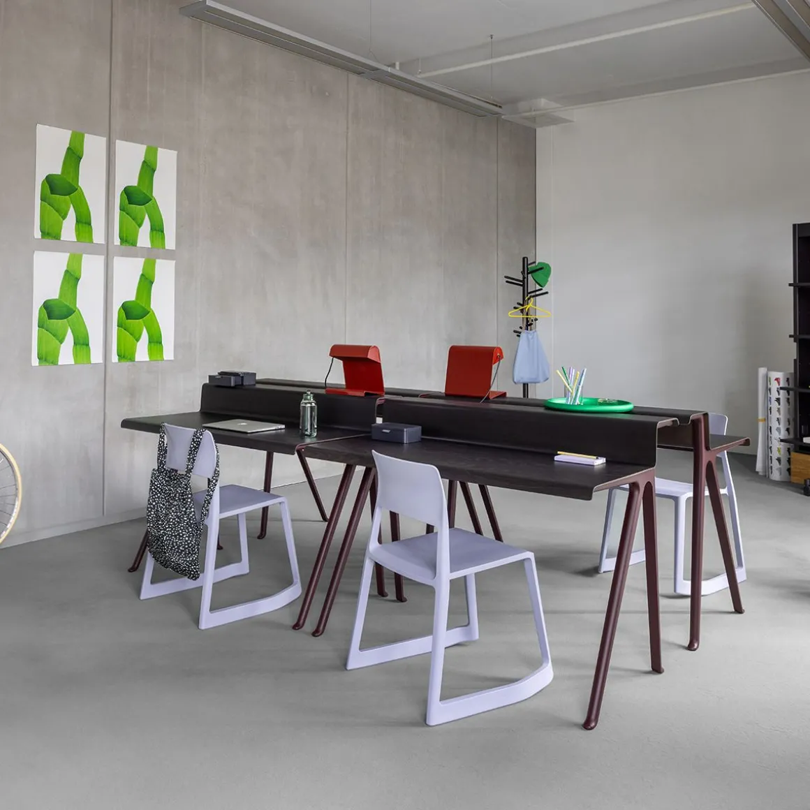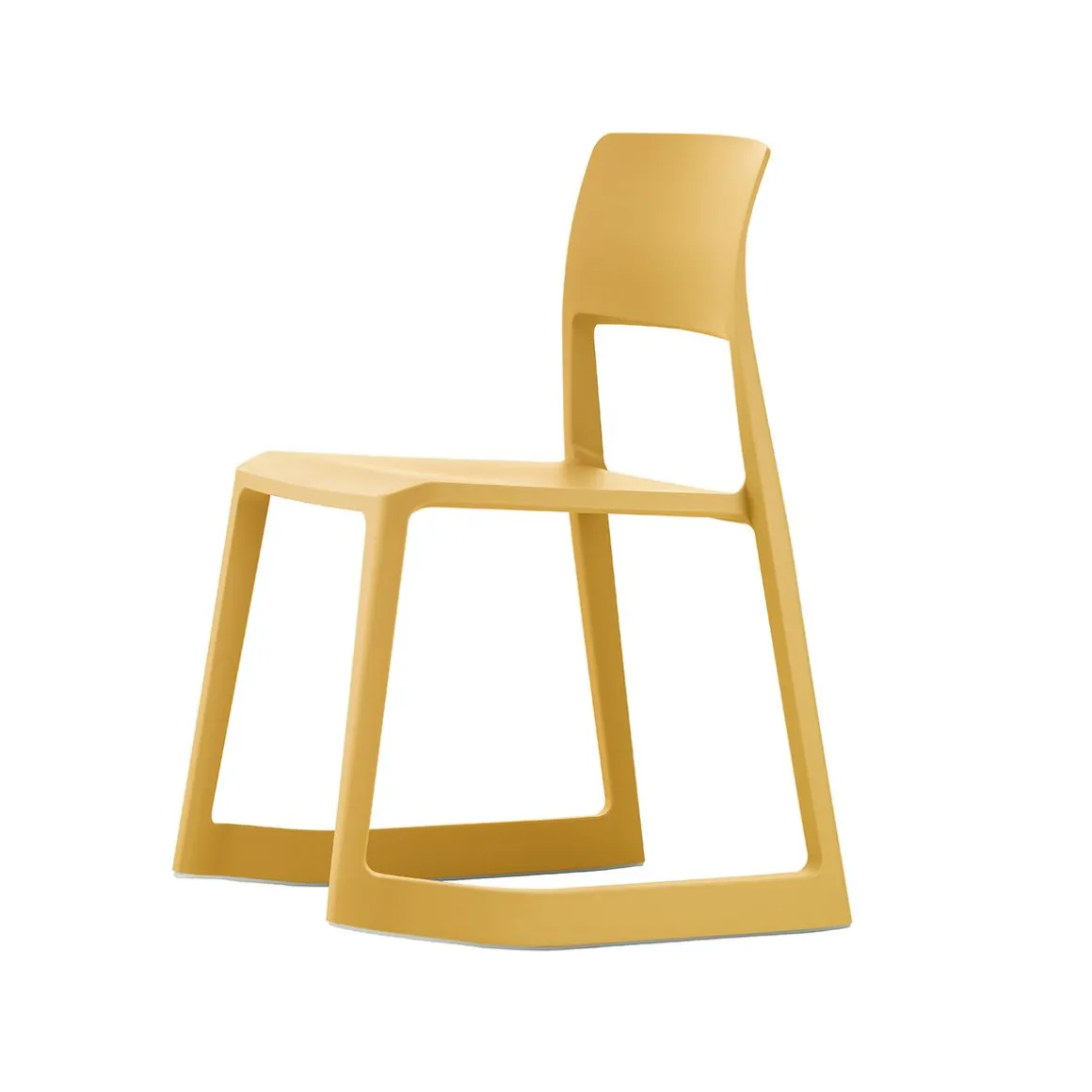 Le siège tout en plastique Tip Ton peut être incliné de quelques degrés vers l’avant par rapport à la position normale. Cette position redresse le bassin et la colonne vertébrale, améliorant ainsi la circulation sanguine dans les muscles abdominaux et dorsaux. En 2020, Vitra a développé une version du siège fabriquée à partir de plastique recyclé : Tip Ton RE. Le matériau de recyclage de haute qualité provient de déchets ménagers recyclés, en particulier des emballages usagés. L’utilisation de cette matière première à la place des plastiques primaires à base de pétrole signifie une réduction de 54% d’émissions novices pour le climat, allant de pair avec un baisse significative de la consommation d’énergie primaire. Pour obtenir la stabilité et la qualité requises, une certaine proportion de fibres de verre est ajoutée au matériau de recyclage. La teinte gris foncé de Tip Ton RE est la teinte naturel du matériau de recyclage traité, présentant de très légères irrégularités de couleur.