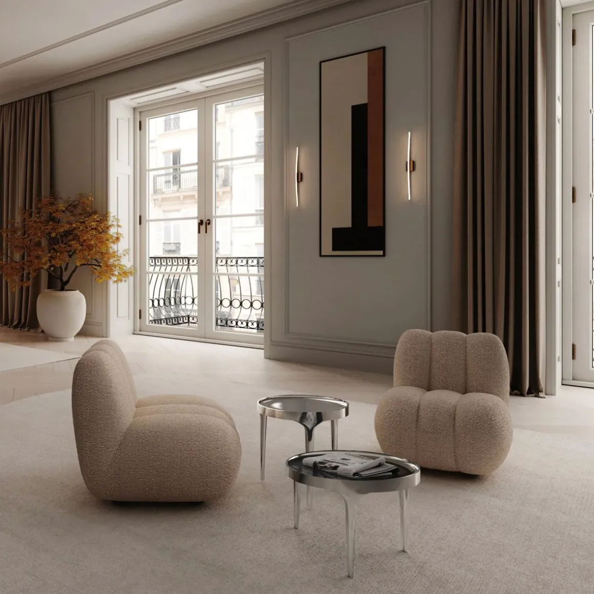 Finitions : blanc cassé (Bouclé), Taupe foncé (Bouclé), Sable fumé (Bouclé), blanc (Lin), taupe (Pallazo), Peau de mouton