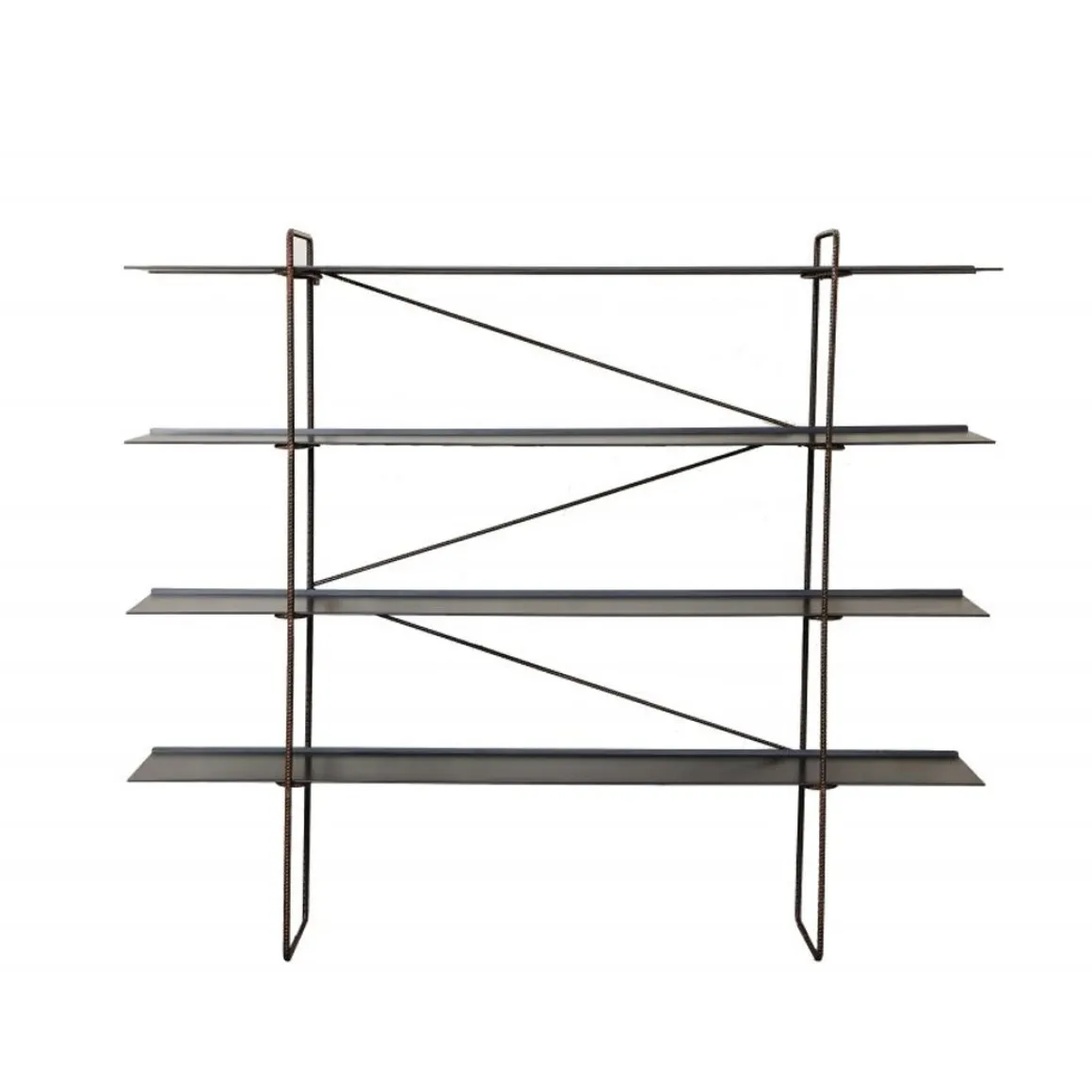 Bibliothèque murale, démontable. Structure en tige d’acier nervurée Ø14 mm. Finition naturelle laqué transparent opaque. Étagère en tôle d’acier naturelle découpée et courbée. Traitement phosphaté noir, fixation final avec de la cire d’abeille.