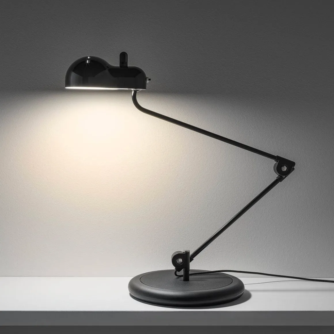 Topo est un fascinant objet d’inspiration automobile : les fentes sur la calotte métallique rappellent les prises d’air des voitures de sport des années 1960, tandis que la forme de l’abat-jour correspond à l’enveloppe de l’ampoule classique E27 logée à l’intérieur, comme un corps sur le moteur sousjacent Les bras articulés en métal permettent d’étendre ou de rétracter la lampe à volonté.