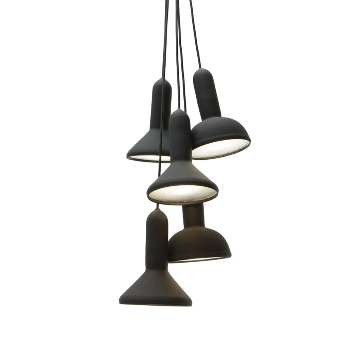 – Taille 1 (S5) : bouquet 5 lampes (3 cônes Ø 15 cm + 2 arrondies Ø 15 cm / Ø totale ~ 30 cm) – 5 x 9W fluo E27 (non fournies) – L câbles 140 cm