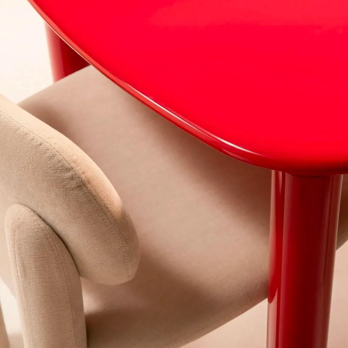 Les éléments distinctifs sont représentés par la forme douce et arrondie du plateau, en MDF avec un bord façonné, et par le diamètre généreux des pieds en bois massif tourné. La finition est une laque brillante en trois variantes de couleur. Usage interne uniquement.
