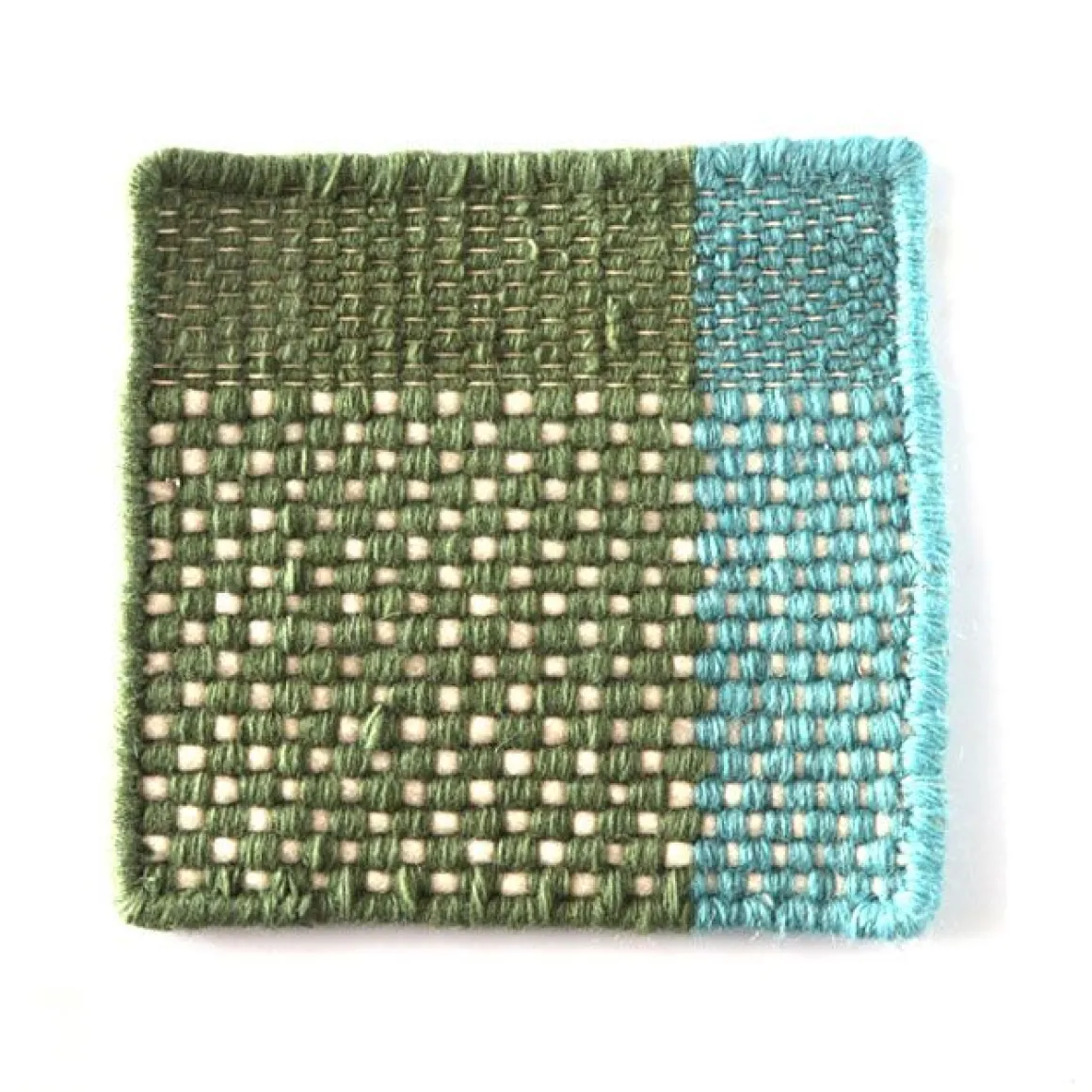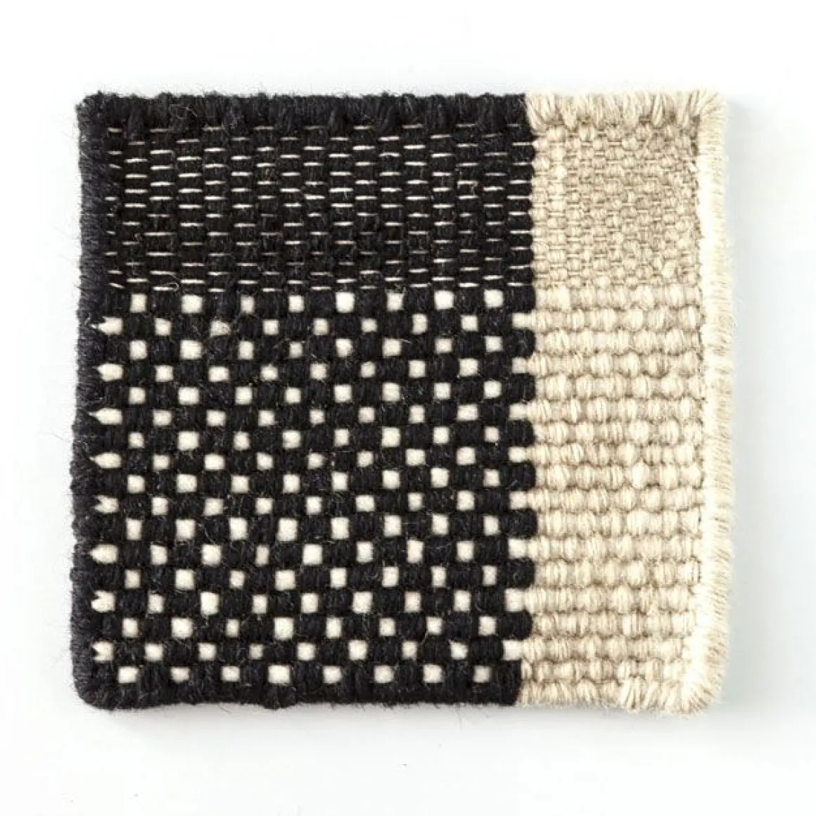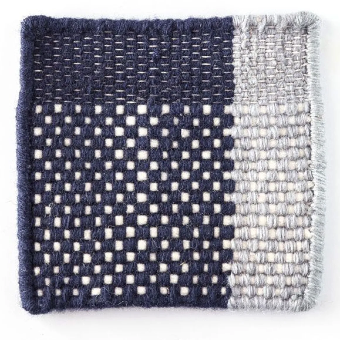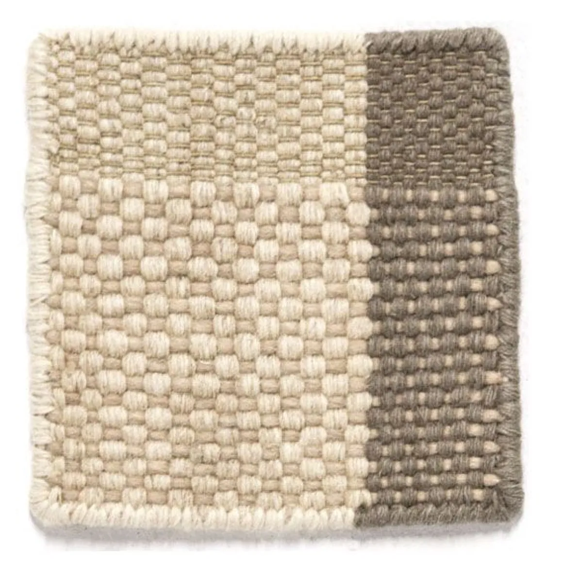 La proportion et la combinaison de la laine, du feutre et du coton génèrent des changements de ton et d’irrégularités dans le tissage, donnant vie au motif.