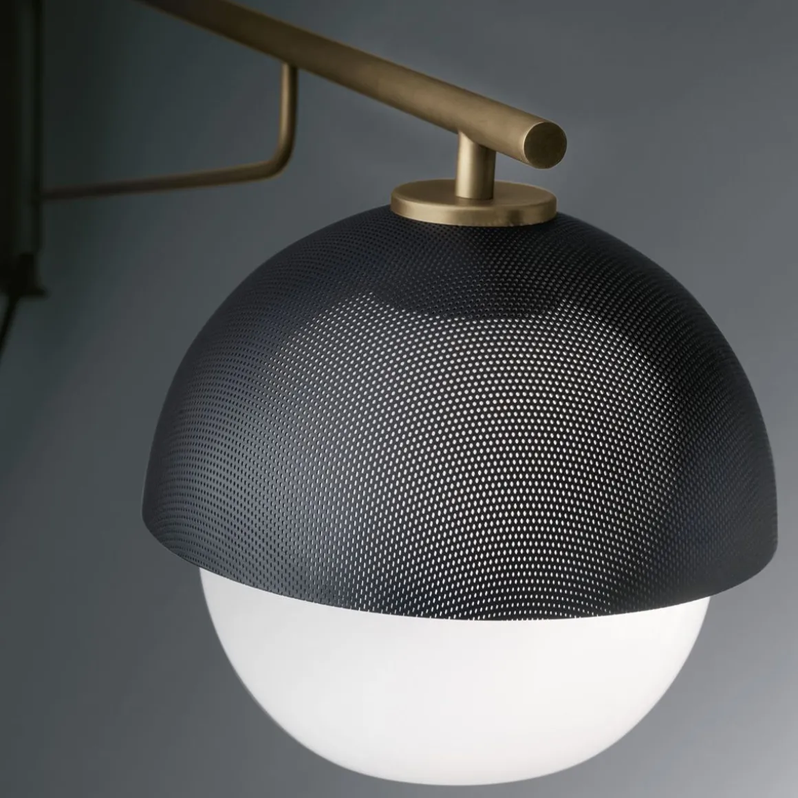Applique orientable à lumière diffuse. Structure en laiton bruni clair ou foncé avec abat-jour en métal perforé or mat ou noir mat. Diffuseur en verre soufflé de Murano blanc.