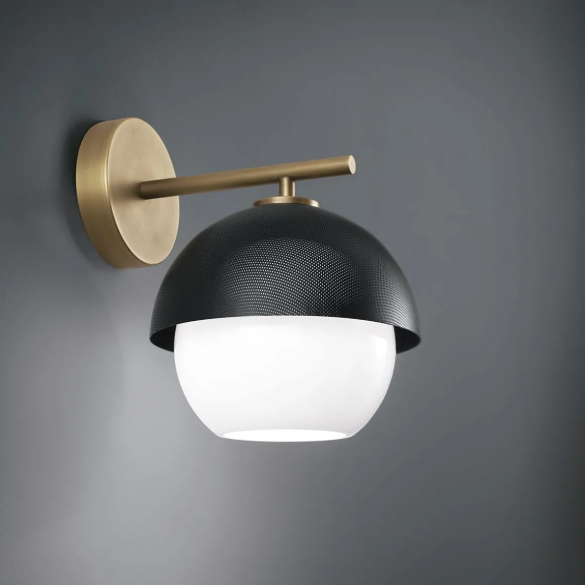Applique à lumière diffuse. Structure en laiton bruni clair ou foncé avec abat-jour en métal perforé or mat ou noir mat. Diffuseur en verre soufflé de Murano blanc.