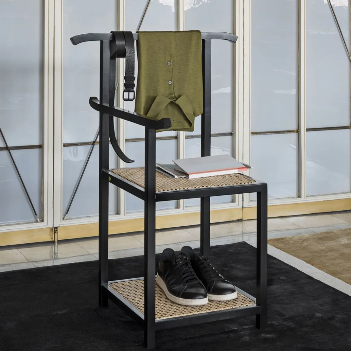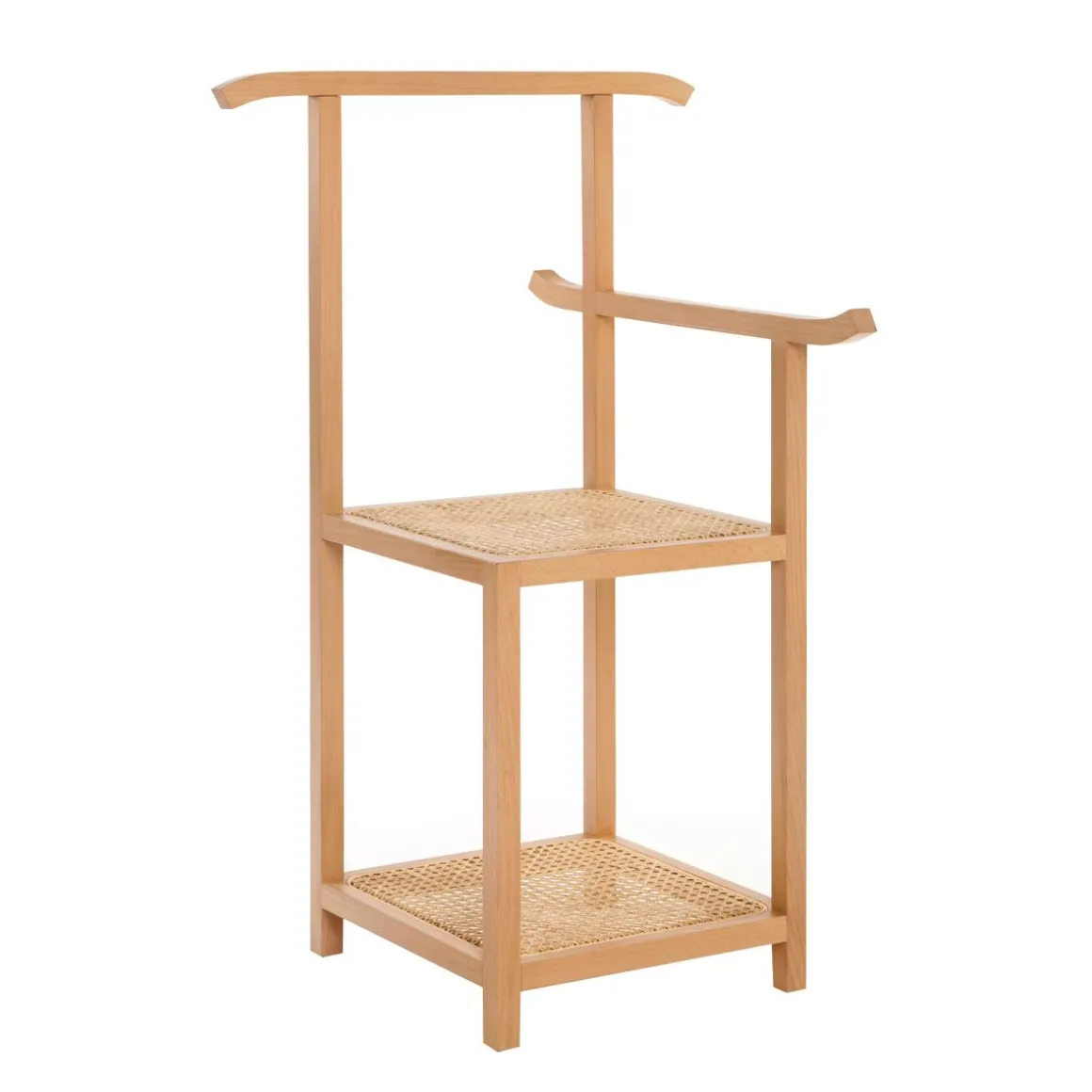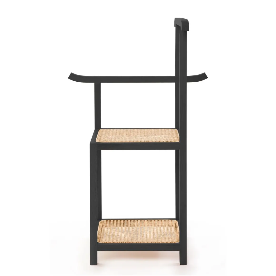 Designer originaire de Singapour, Nathan Yong signe une pièce au style minimaliste, avec des références orientales. Fonctionnel, ce meuble 2-en-1 fait office de valet et de chaise : pratique pour s’asseoir afin d’enfiler ses chaussures ! L’étagère située sous l’assise permet de ranger vos sacs et souliers. Le dossier et l’accoudoir servent de cintres pour suspendre vos vêtements ou serviettes. Majordome trouve sa place dans une chambre ou une salle de bains. Majordomo se compose d’une structure en frêne hêtre massif à section carrée. L’assise et l’étagère sont en cannage de paille naturelle.