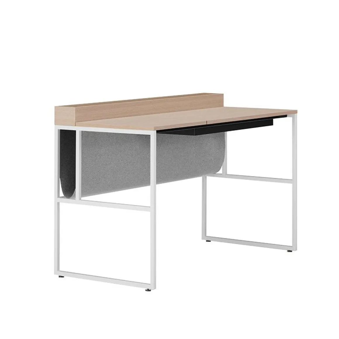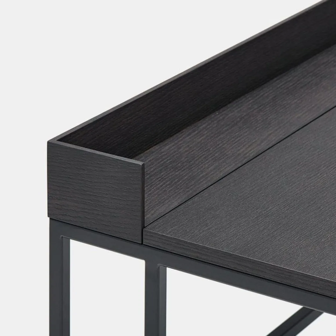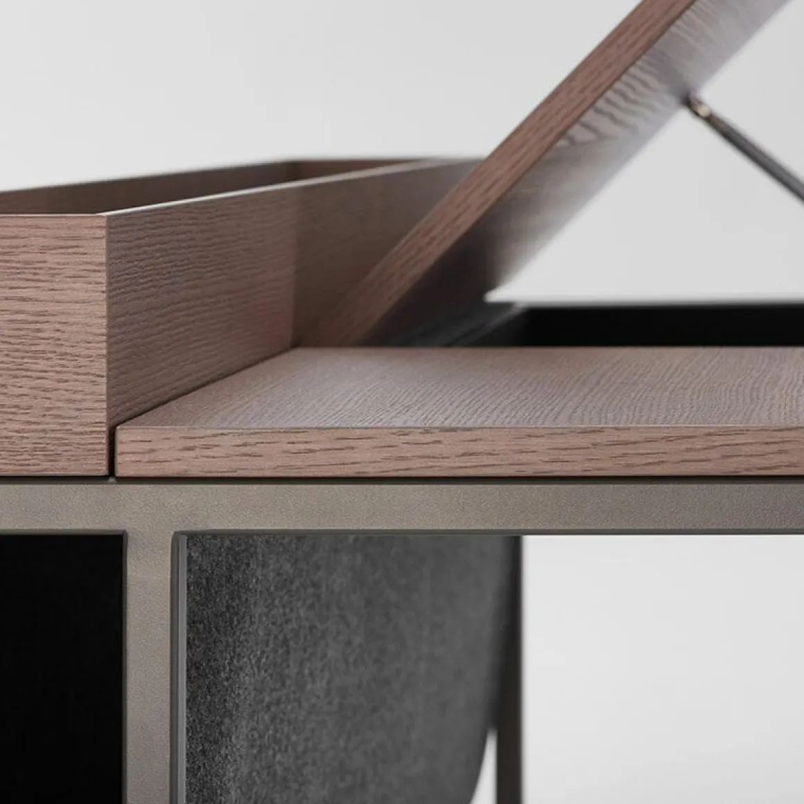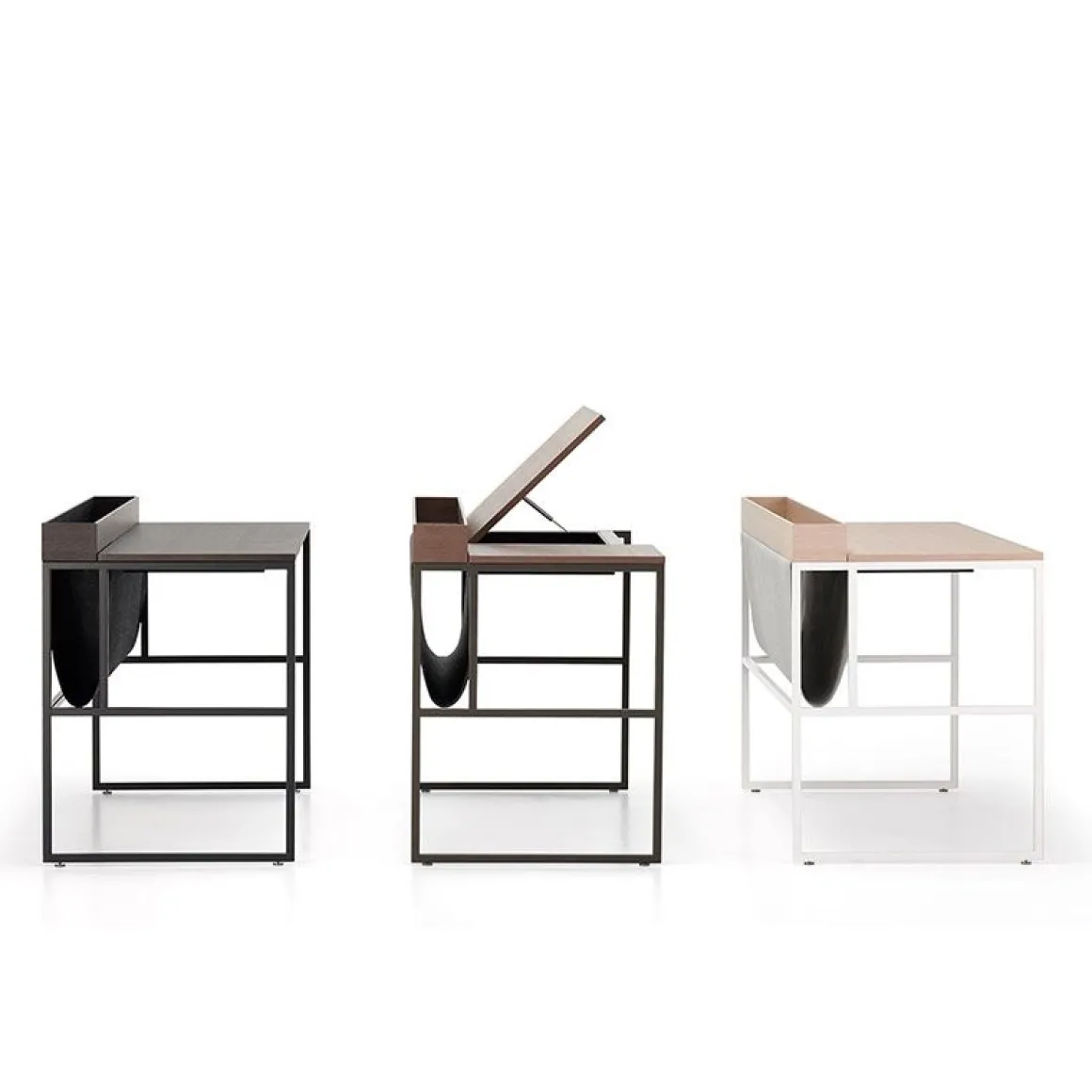 Structure et pieds en acier, section 2x2cm, peints à la poudre époxy dans les couleurs blanc mat, nickel noir et bronze ; plateaux en fibres de moyenne densité plaqués chêne, brossés et à pores ouverts, dans la couleurs chêne blanchi, clair et anthracite.