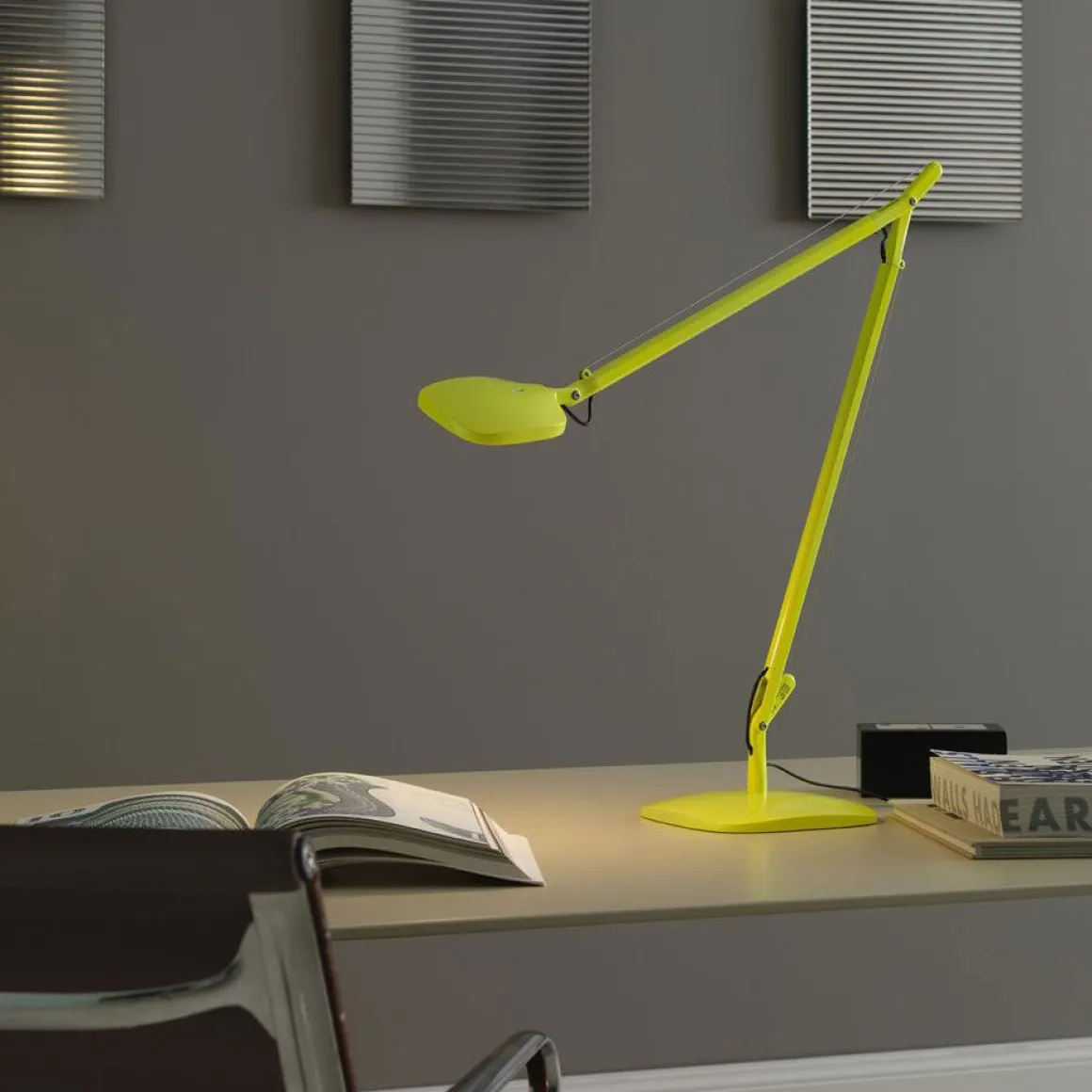 Volée naît d’une réflexion sur les changements dans les styles de vie et de travail et, par conséquent, sur combien l’utilisation des instruments qui leur sont liés a évolué, des meubles à l’éclairage en passant par les accessoires actuellement présents dans les lieux de travail. Une transformation qui résume un changement qui a fait date, celui du passage du poste de travail fixe au poste de travail nomade où papier et crayon cohabitent avec les instruments informatiques et technologiques les plus innovants.Un nouveau paysage, fait d’objets flexibles et intuitifs, qui a donné vie à un concept plus approfondi sur l’utilisation de cette lampe. Volée s’allume en effet d’un geste qui évoque le tennis : un simple mouvement de la main sous la tête de l’appareil actionne un dispositif électronique qui allume et éteint la lampe sans avoir besoin de la toucher, tandis qu’un capteur à effleurement situé sur le dessus de la tête permet de régler le flux lumineux suivant trois niveaux d’intensité. Une carte à LED de la dernière génération fournit une lumière douce et réglable qui se diffuse sur nos mains et sur le plan de travail, en assurant ungrand confort visuel. Un système « Time Out » permet l’extinction automatique de la lampe après 8 heures de fonctionnement. La lampe est composée de tiges structurales en aluminium extrudé, de joints en aluminium moulé sous pression et de câbles mécaniques en acier avec gaine colorée. Disponible en quatre finitions laquées mates : blanc, gris,noir et jaune.