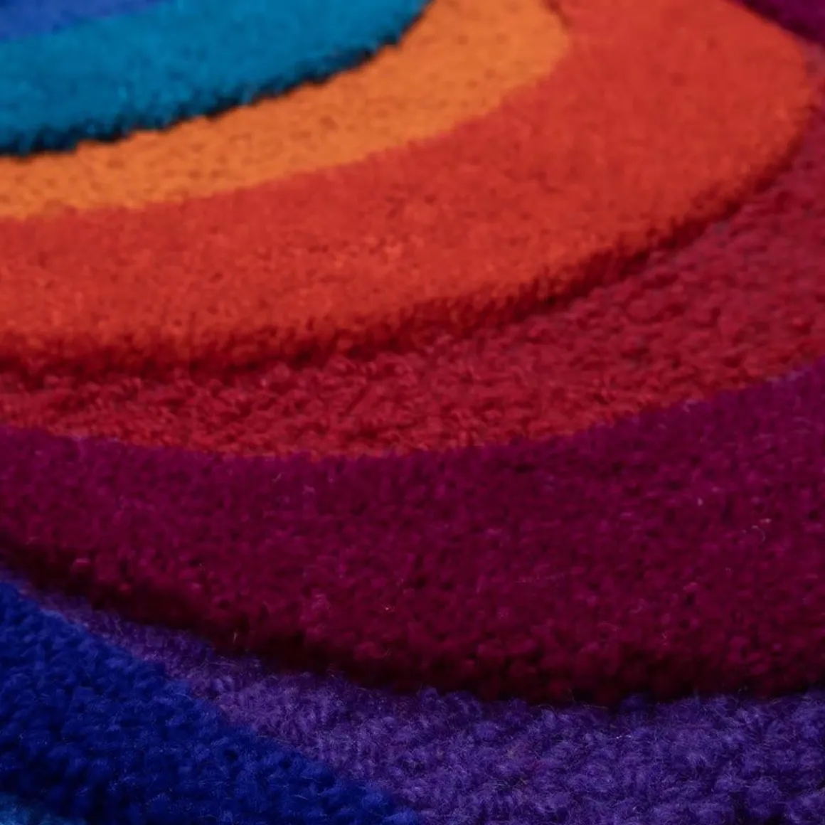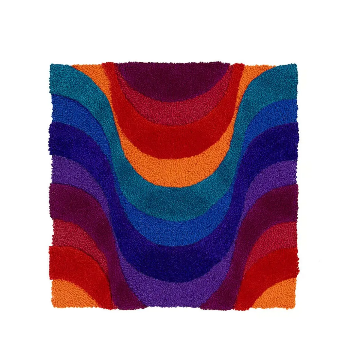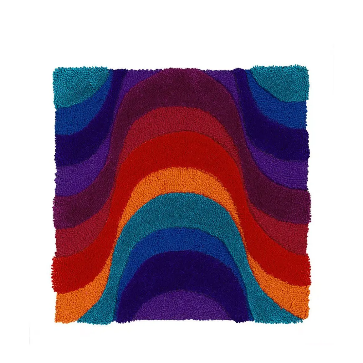VP Domino Wave de Amini par Verner Panton. À partir d’un projet développé en 1974, la collection présente dix modules carrés de taille identique (60×60 cm) définis par autant de motifs géométriques, dans les huit couleurs de la série de couleurs de Panton. Cercles, carrés, vagues, rayures, quarts de cercle et quarts de carré, réalisés en laine précieuse et touffetés à la main, se prêtent à être librement composés pour donner vie aux motifs les plus variés. Les modules sont parfaitement adaptés pour décorer non seulement les sols, mais aussi les murs, et ils peuvent en outre être utilisés pour optimiser les qualités acoustiques d’un espace.