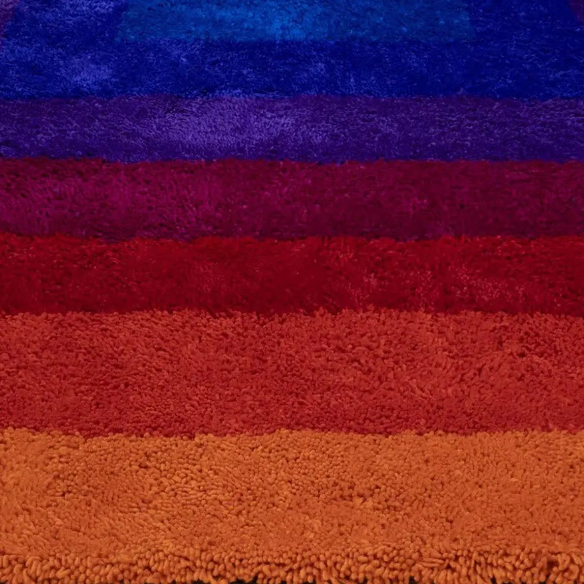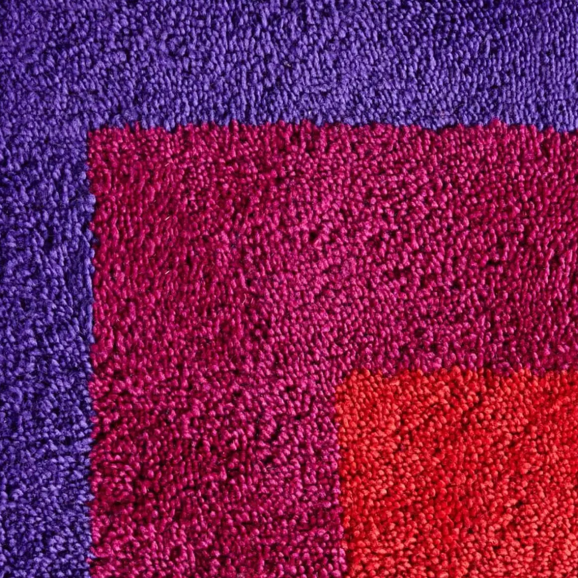 VP Romantica Square de Amini par Verner Panton. La couleur est forme et la forme est couleur dans cette collection qui propose six tapis basés sur la série de couleurs de Panton et les géométries pures du cercle, du carré et de la vague. Les tapis Romatica sont noués à la main avec un poil long et légèrement hirsute en utilisant de la laine néo-zélandaise de première qualité. Les tapis carrés et ronds, avec un motif de cadres concentriques, sont également disponibles dans la variante avec la série de couleurs inversées. Les tapis à vagues, en deux formats, se distinguent par un fond violet.