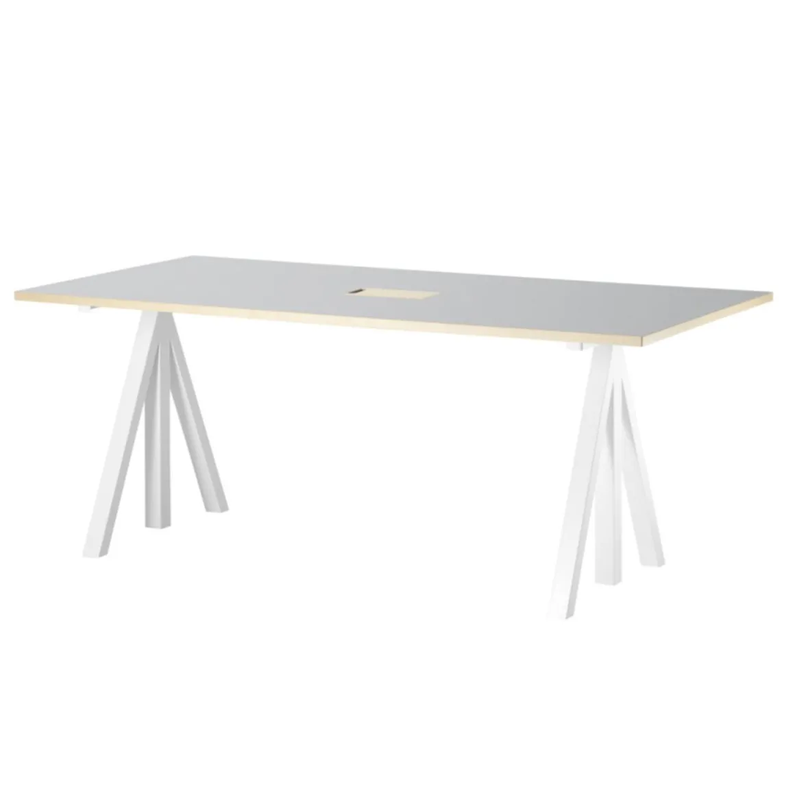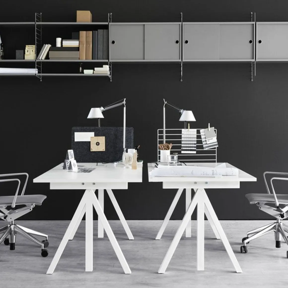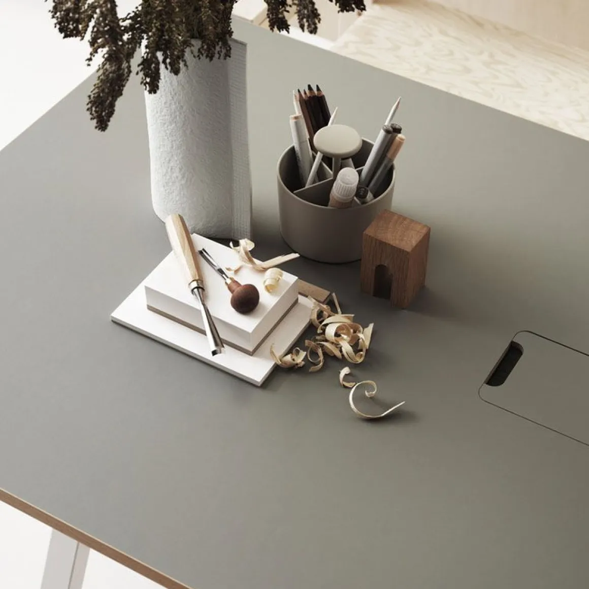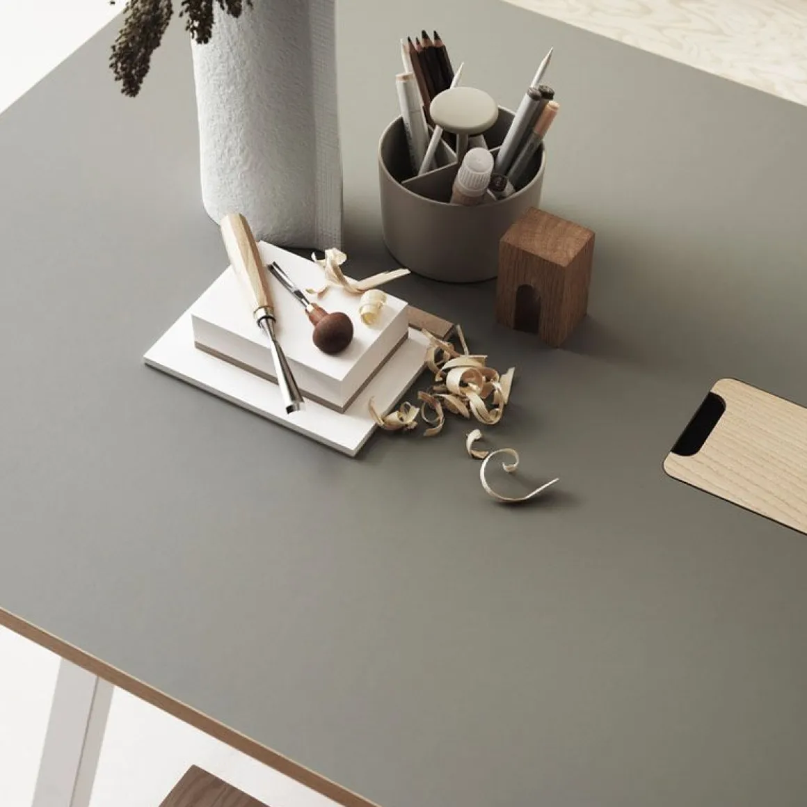 Avec son design unique, le bureau de travail de Works permet de créer des espaces de travail flexibles. Le bureau de travail se compose d’un cadre de table fixe et d’un bureau de travail et la hauteur peut être ajustée de 1 cm. Les bureaux de 78 cm de profondeur sont disponibles en trois largeurs : 120, 140 et 160 cm. Le bureau de travail avec une profondeur de 90 cm est destiné à une table de réunion ou à un espace de travail plus grand et est donc disponible en une seule largeur, 180 cm. La hauteur du cadre (y compris le bureau) est de 72,5 cm et s’adapte à tous les bureaux.
