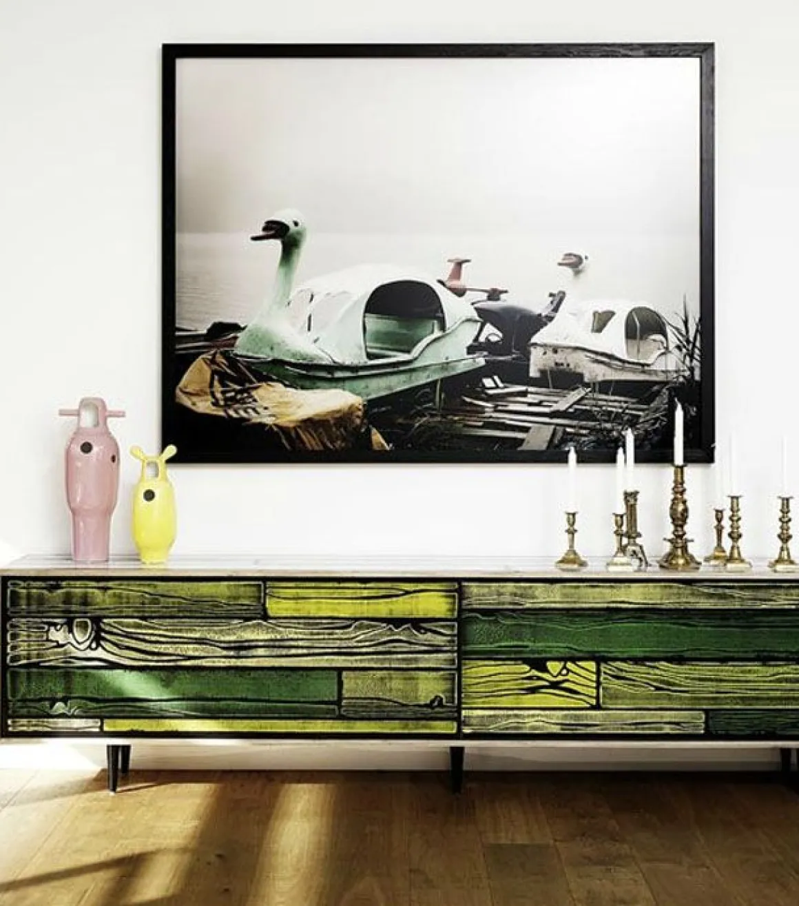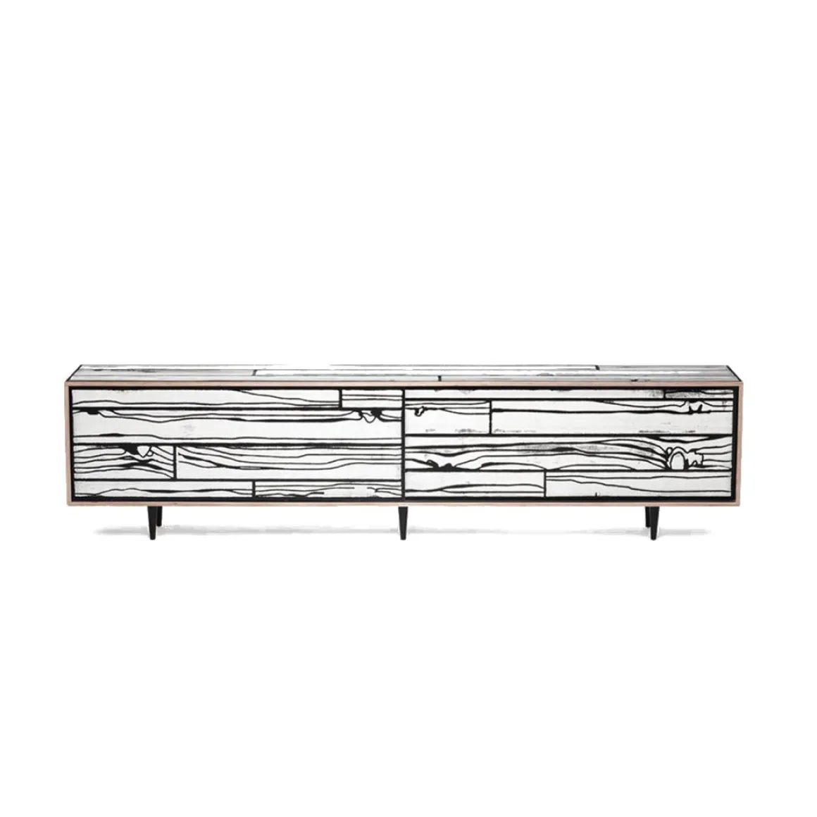 Le mobilier »WrongWoods » a été dessiné par le designer Sebastian Wrong et décoré par l’artiste Richard Woods dans le cadre de son projet »Collaborations », Established & Sons. Un duo explosif qui réinterprète de façon audacieuse et ultra originale le mobilier moderniste d’après-guerre. Ces meubles en contreplaqué sont habillés d’un imprimé façon cartoon imitant des planches de bois coloré. Ces motifs aux coloris vifs sont à la fois classiques et dissonants. Le résultat, volontairement osé et tape-à-l’oeil est une façon pour Richard Woods de ridiculiser le faux bon goût des intérieurs bourgeois. Un style british survitaminé, plein de fantaisie qui amuse par son ironie.