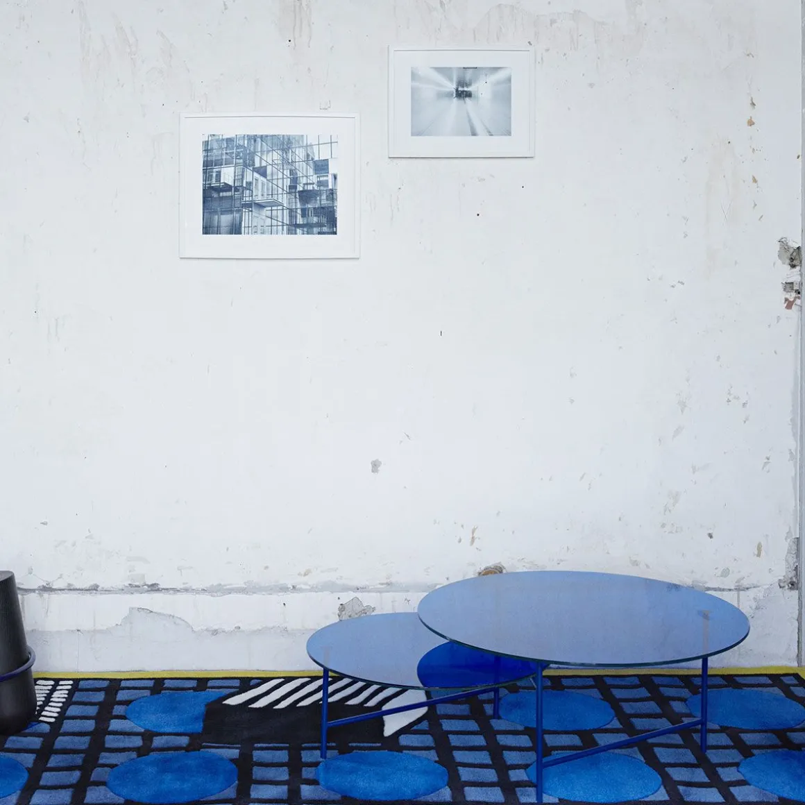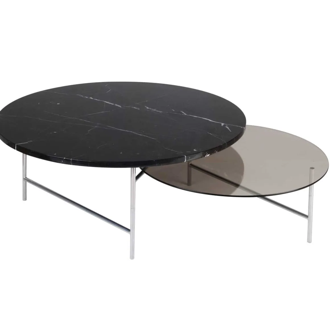 Finitions : Structure chromée + Verre smocké + Marbre noir Marquina ou Structure bleue + 2 plateaux en verre bleu