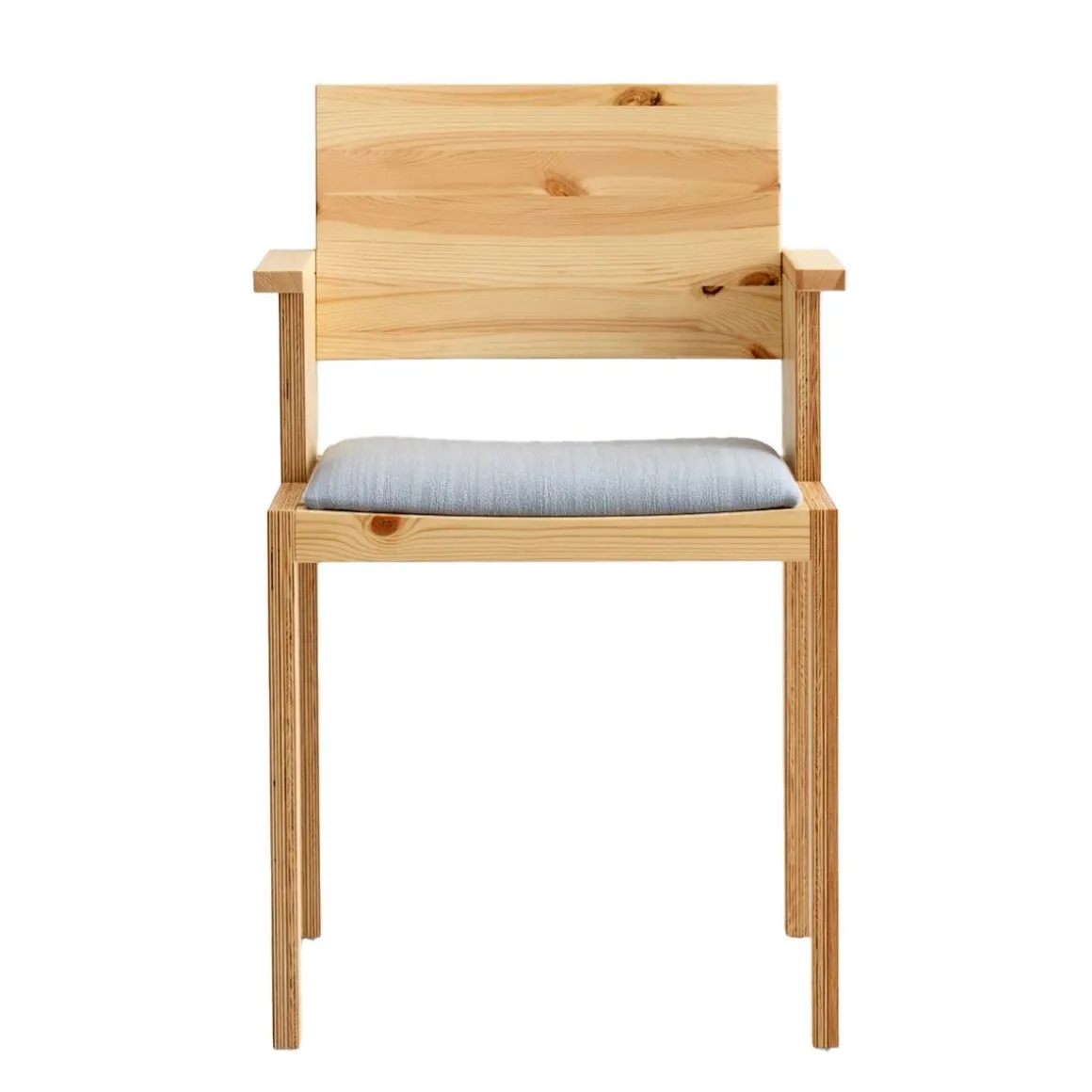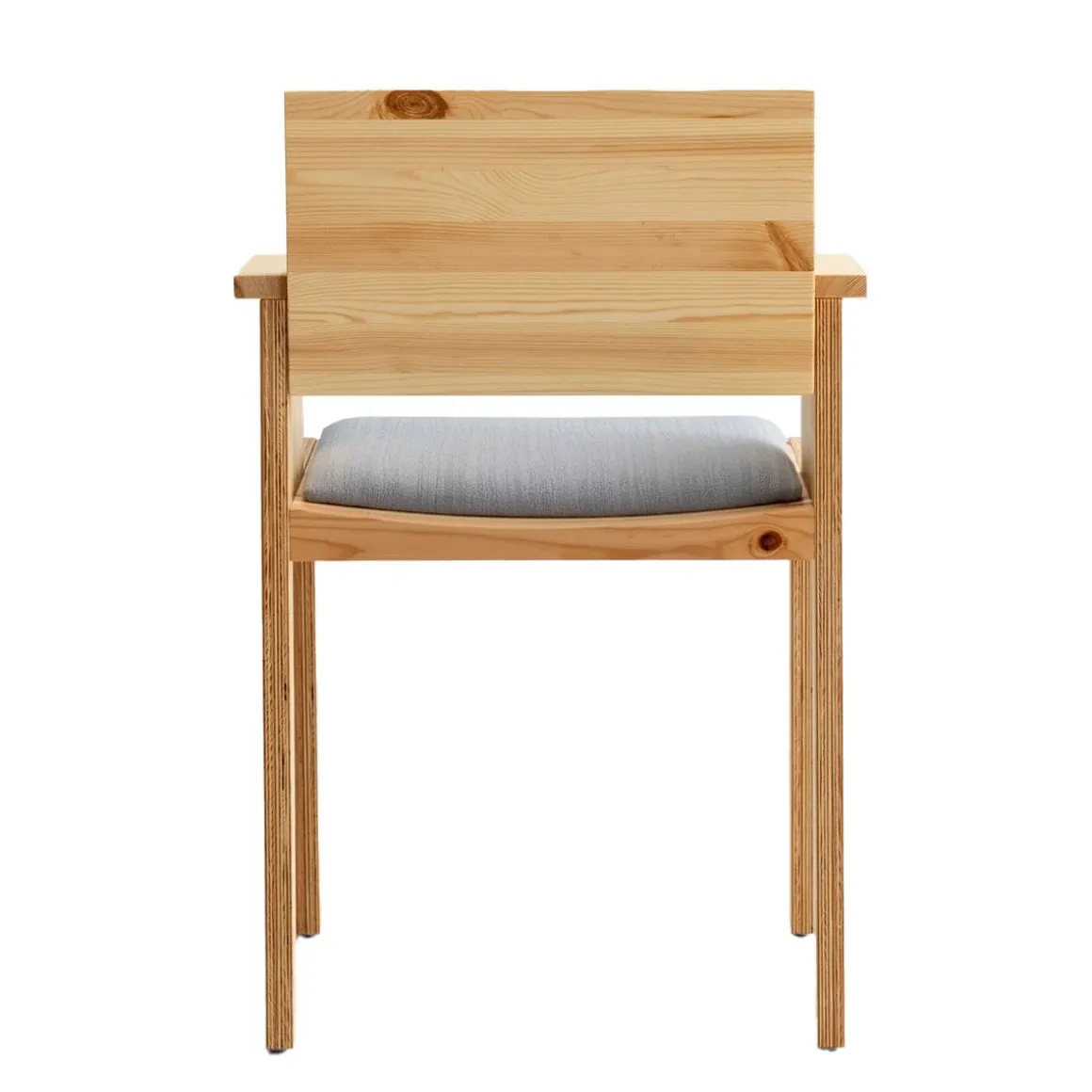 Simple et solide, la chaise de salle à manger 016 Maasto de Ronan Bouroullec est une ode au pin et un archétype instantané du mobilier en pin. La version rembourrée de ce siège robuste est dotée d’un rembourrage moelleux, soit sur l’assise seule, soit sur l’assise et le dossier. Les coussins sont fixés au dossier par des clips métalliques dissimulés et vissés à la base . Le revêtement est signé Alle par Ronan Bouroullec de Kvadrat. Les coussins fins ne perturbent pas la silhouette harmonieuse de la chaise. Les côtés en contreplaqué confèrent solidité, allègent le volume et simplifient la construction, tandis que l’assise et le dossier en pin massif garantissent la durabilité. Le contreplaqué Vaarnii présente un veinage accentué, créant une esthétique enivrante de pin superbe. La chaise de salle à manger Maasto est dotée d’accoudoirs en contreplaqué pour un confort d’assise optimal.