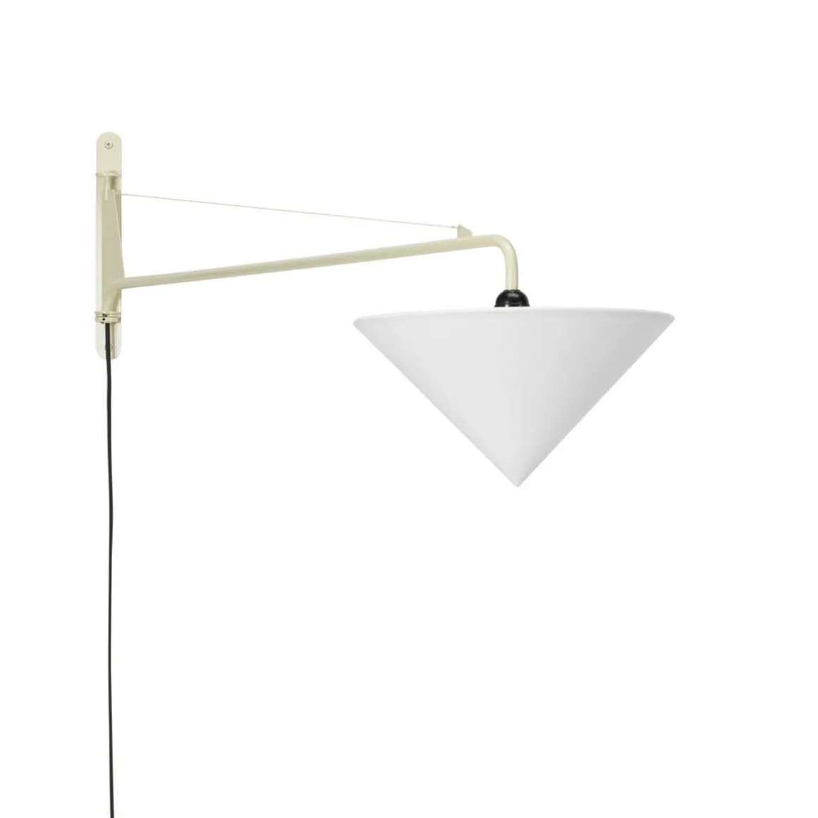Durant les année 1940, Jean Prouvé a conçu la lampe murale Potence pour sa propre maison à Nancy : une simple ampoule fixée à une longue barre pivotante en acier, maintenue par un fil d’acier. En 1947, Prouvé a développé un abat-jour de forme conique qui s’adapte aux différentes versions et tailles de Potence. Des photos historiques de la maison de Jean Prouvé montrent qu’il a expérimenté différente types d’abat-jour, y compris des modèles conçus par d’autres créateurs.