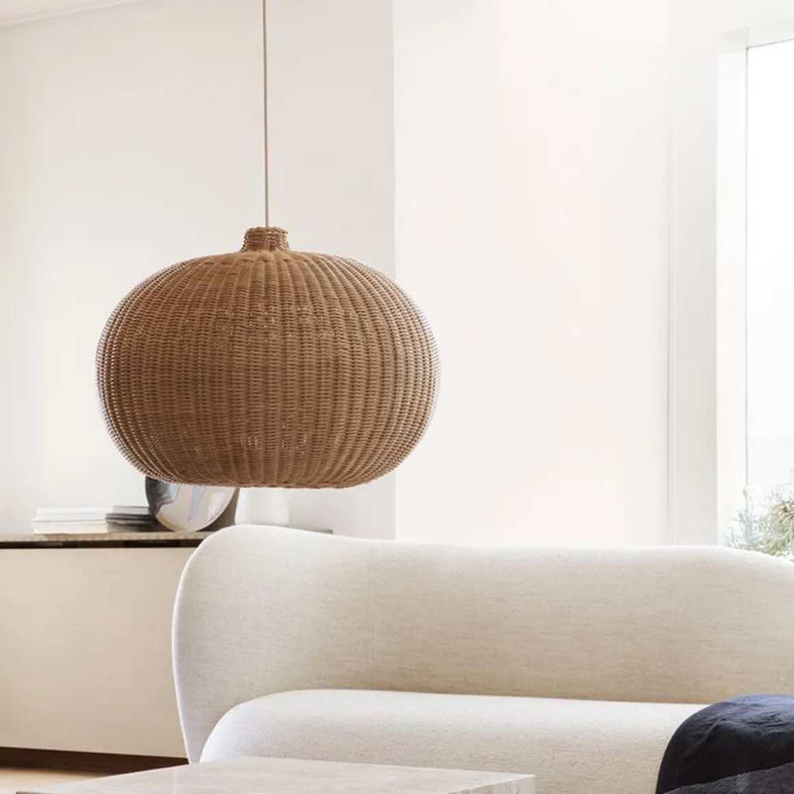 Ce grand abat-jour bombé est tressé à la main en rotin et fournira une belle source de lumière naturelle dans une pièce. Que vous l’accrochiez au plafond au-dessus de votre table à manger ou que vous l’utilisiez comme point focal dans un coin, la lampe laisse de petits aperçus de lumière à travers son ombre naturelle, tandis que le trou inférieur donne une lumière plus dirigée vers le bas. Il est livré avec un cordon recouvert de tissu et un auvent en plastique assorti.