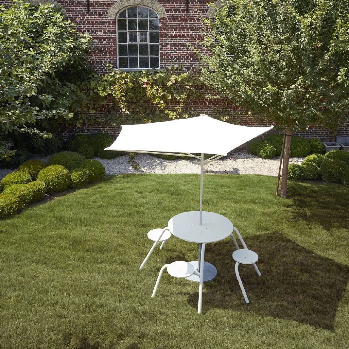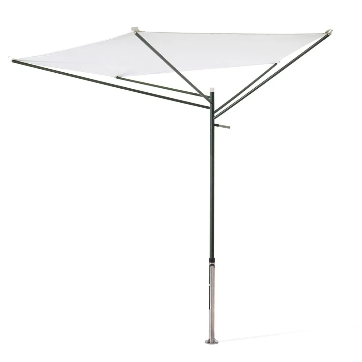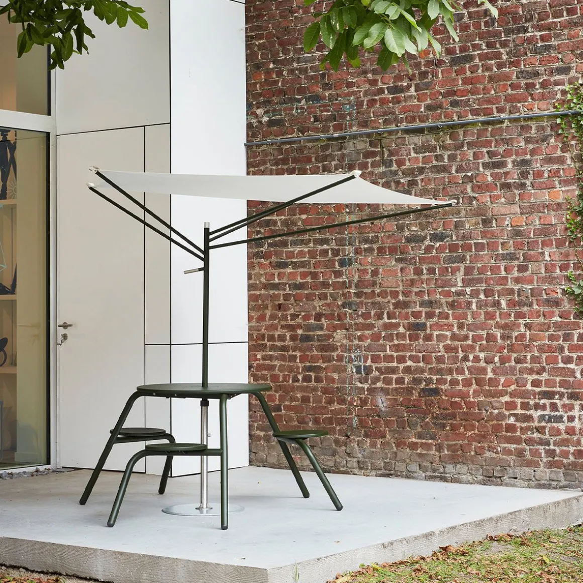 Acacia de Extremis par Dirk Wynants. Ce parasol compact et asymétrique en forme d’acacia s’adapte à un espace restreint. Sa conception astucieuse permet de produire autant d’ombre qu’un parasol plus grand, avec une surface bien plus réduite. Il suffit de tourner Acacia vers le soleil avec la poignée. L’éclairage optionnel sous la toile permet de prolonger la lumière du jour après le coucher du soleil. Plutôt que de fermer le parasol, il suffit de retirer la toile et de la ranger dans sa housse. Il restera alors une belle sculpture en forme d’arbre qui peut passer l’année à l’extérieur. Nous nous sommes inspirés de l’acacia africain, qui a perfectionné la protection contre le soleil au long de milliers d’années d’évolution. Ce parasol solide et résistant au vent détourne un maximum de soleil avec un minimum de surface. Il n’est pas nécessaire de le fermer, il suffit d’abaisser le mât et de retirer la toile. Dépourvue de sa toile, la structure est une œuvre d’art, ajoutant à votre espace extérieur une sculpture biophilique évoquant un arbre, même pendant les sombres journées hivernales.