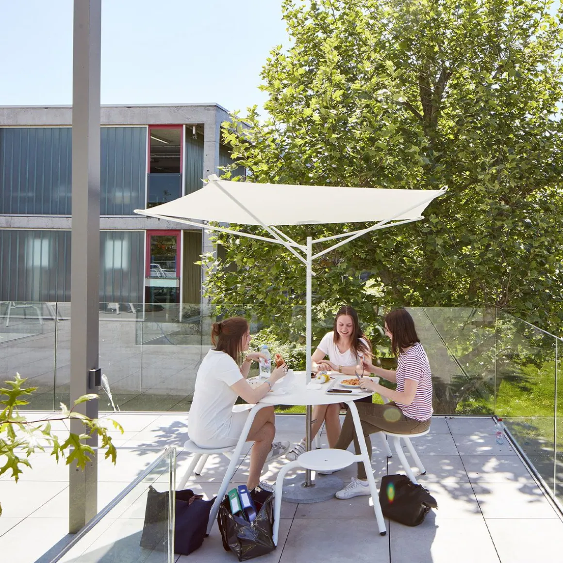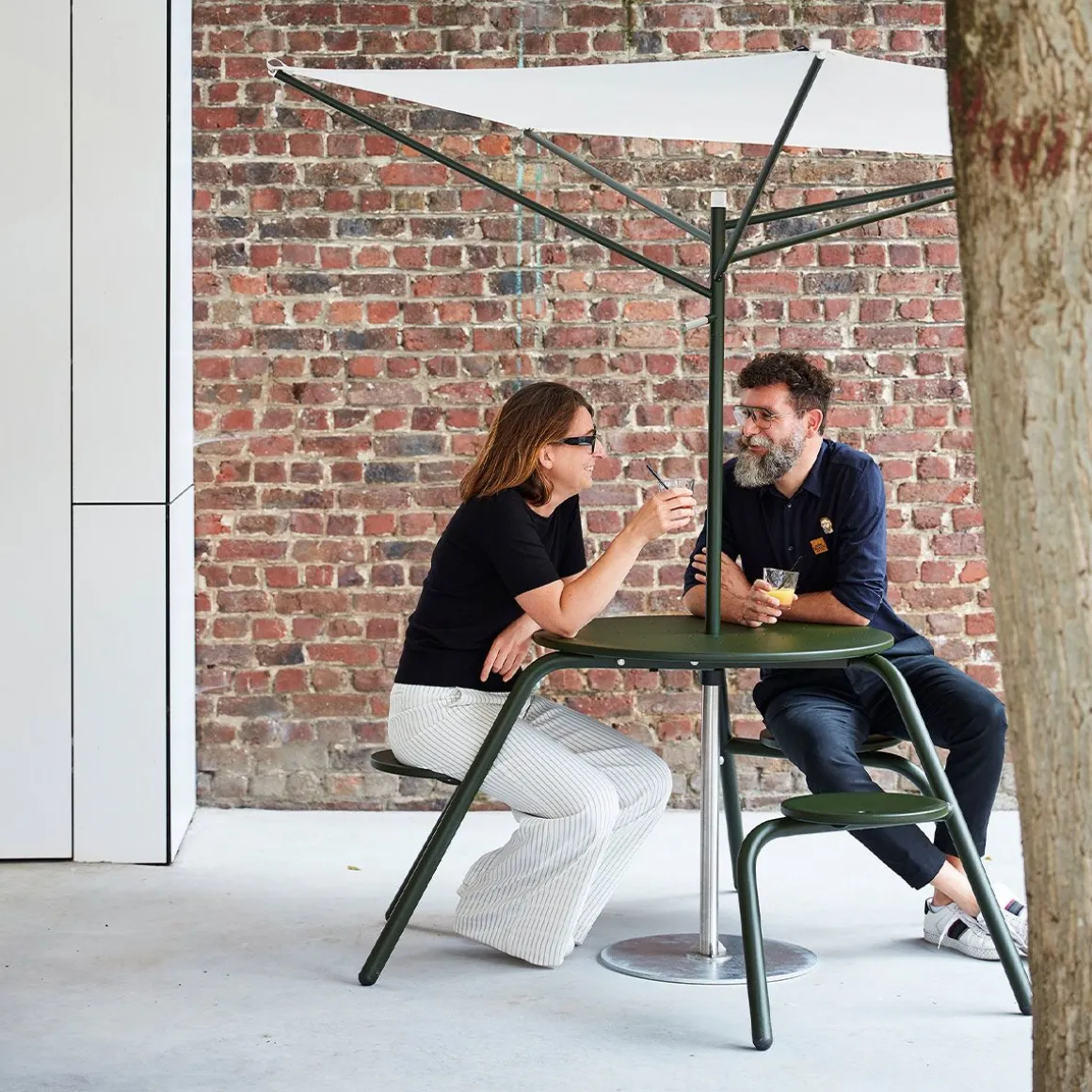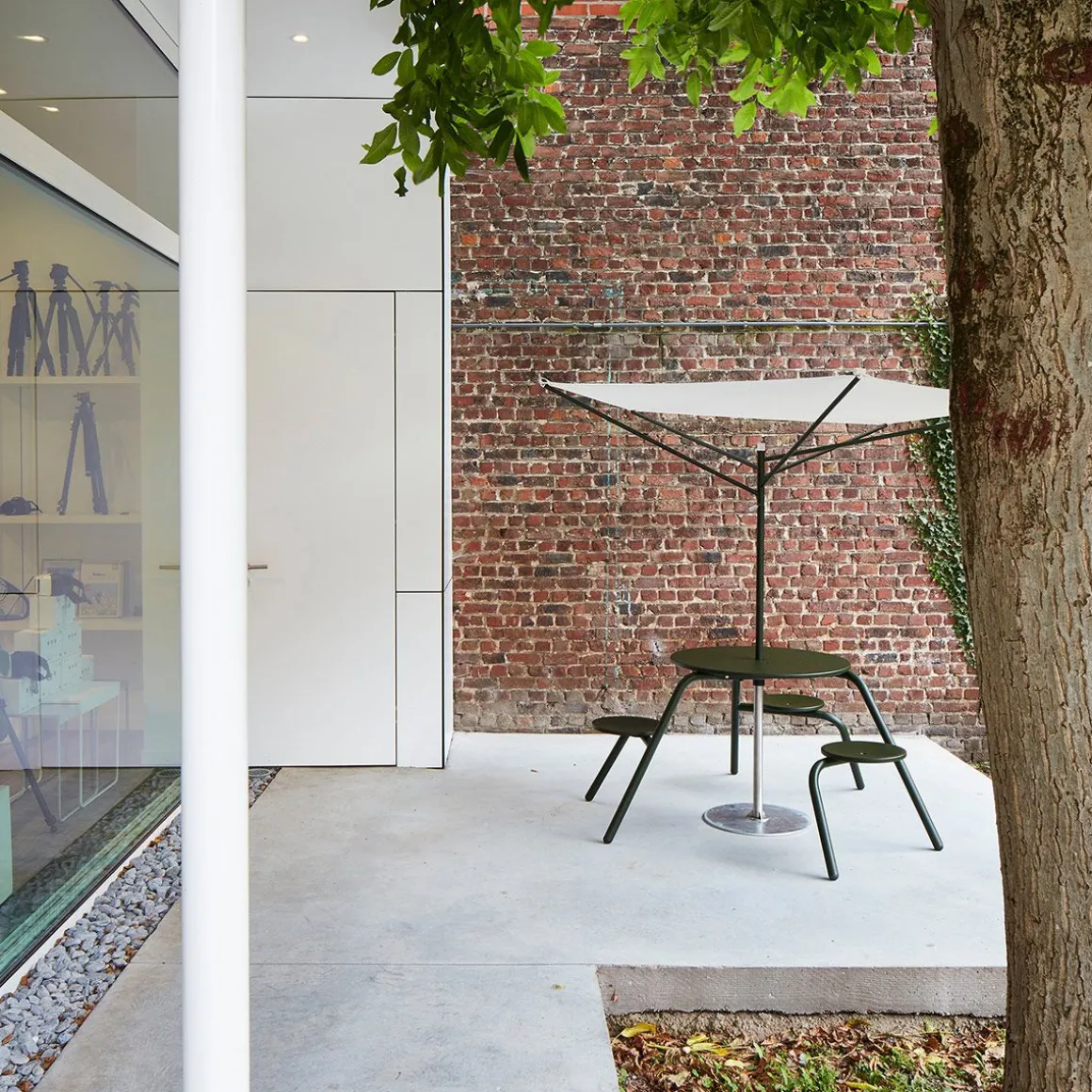 Acacia de Extremis par Dirk Wynants. Ce parasol compact et asymétrique en forme d’acacia s’adapte à un espace restreint. Sa conception astucieuse permet de produire autant d’ombre qu’un parasol plus grand, avec une surface bien plus réduite. Il suffit de tourner Acacia vers le soleil avec la poignée. L’éclairage optionnel sous la toile permet de prolonger la lumière du jour après le coucher du soleil. Plutôt que de fermer le parasol, il suffit de retirer la toile et de la ranger dans sa housse. Il restera alors une belle sculpture en forme d’arbre qui peut passer l’année à l’extérieur. Nous nous sommes inspirés de l’acacia africain, qui a perfectionné la protection contre le soleil au long de milliers d’années d’évolution. Ce parasol solide et résistant au vent détourne un maximum de soleil avec un minimum de surface. Il n’est pas nécessaire de le fermer, il suffit d’abaisser le mât et de retirer la toile. Dépourvue de sa toile, la structure est une œuvre d’art, ajoutant à votre espace extérieur une sculpture biophilique évoquant un arbre, même pendant les sombres journées hivernales.