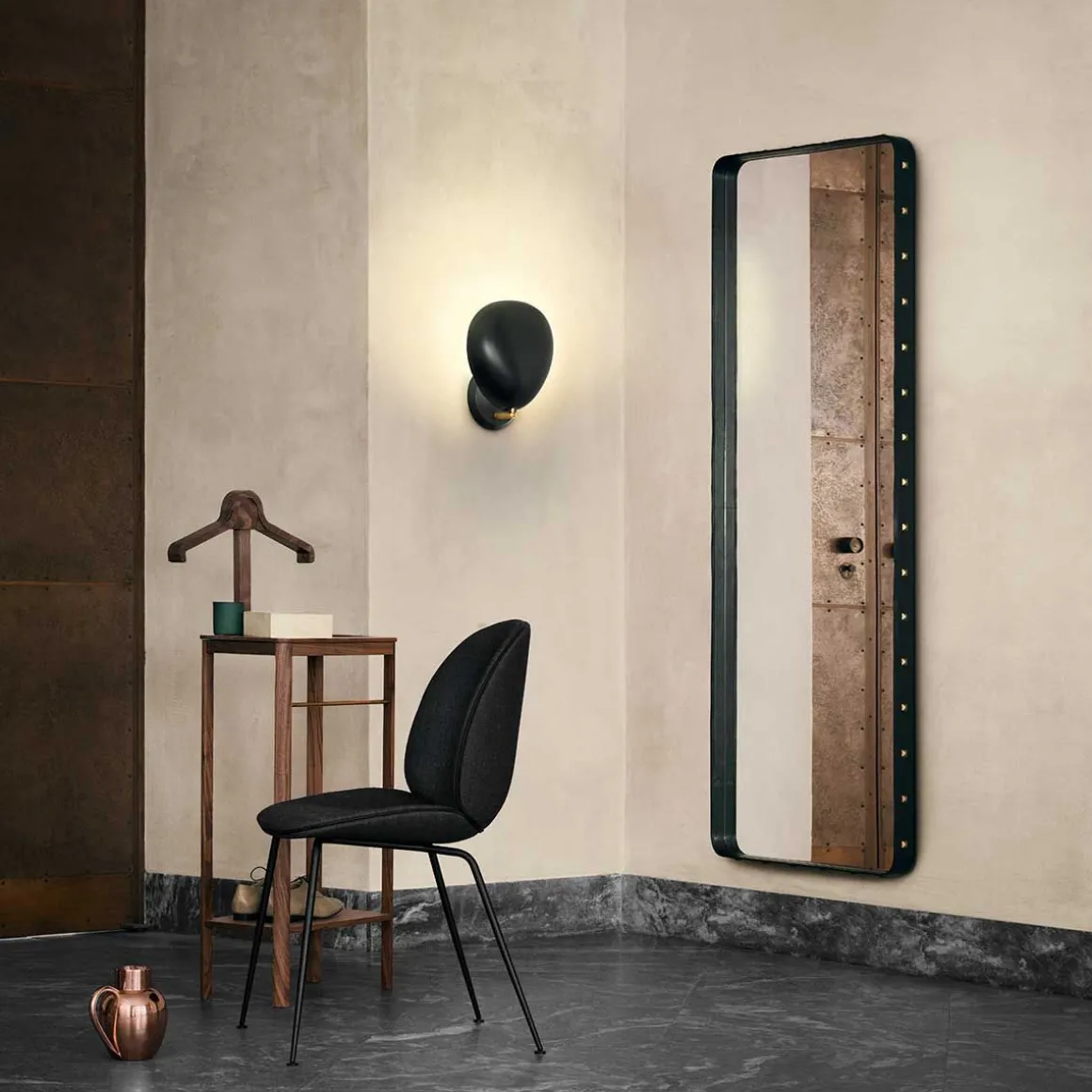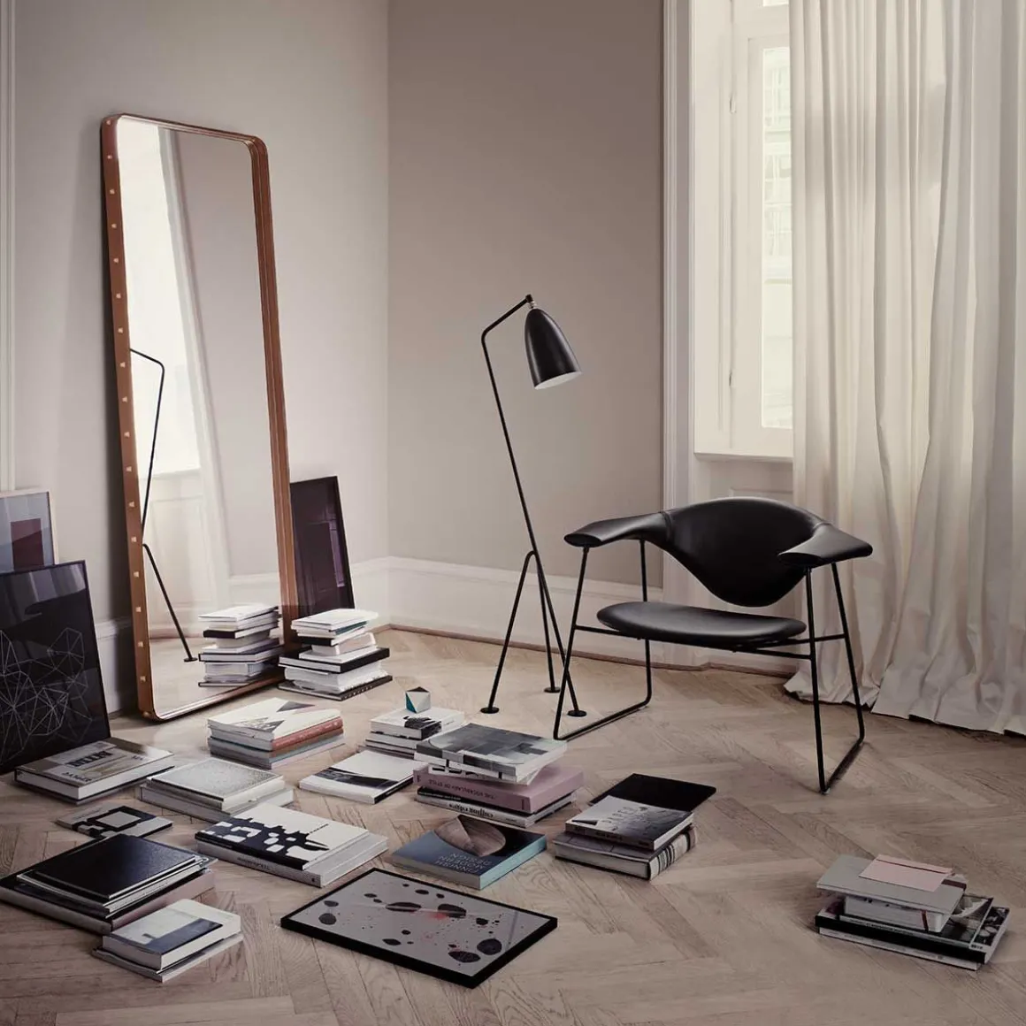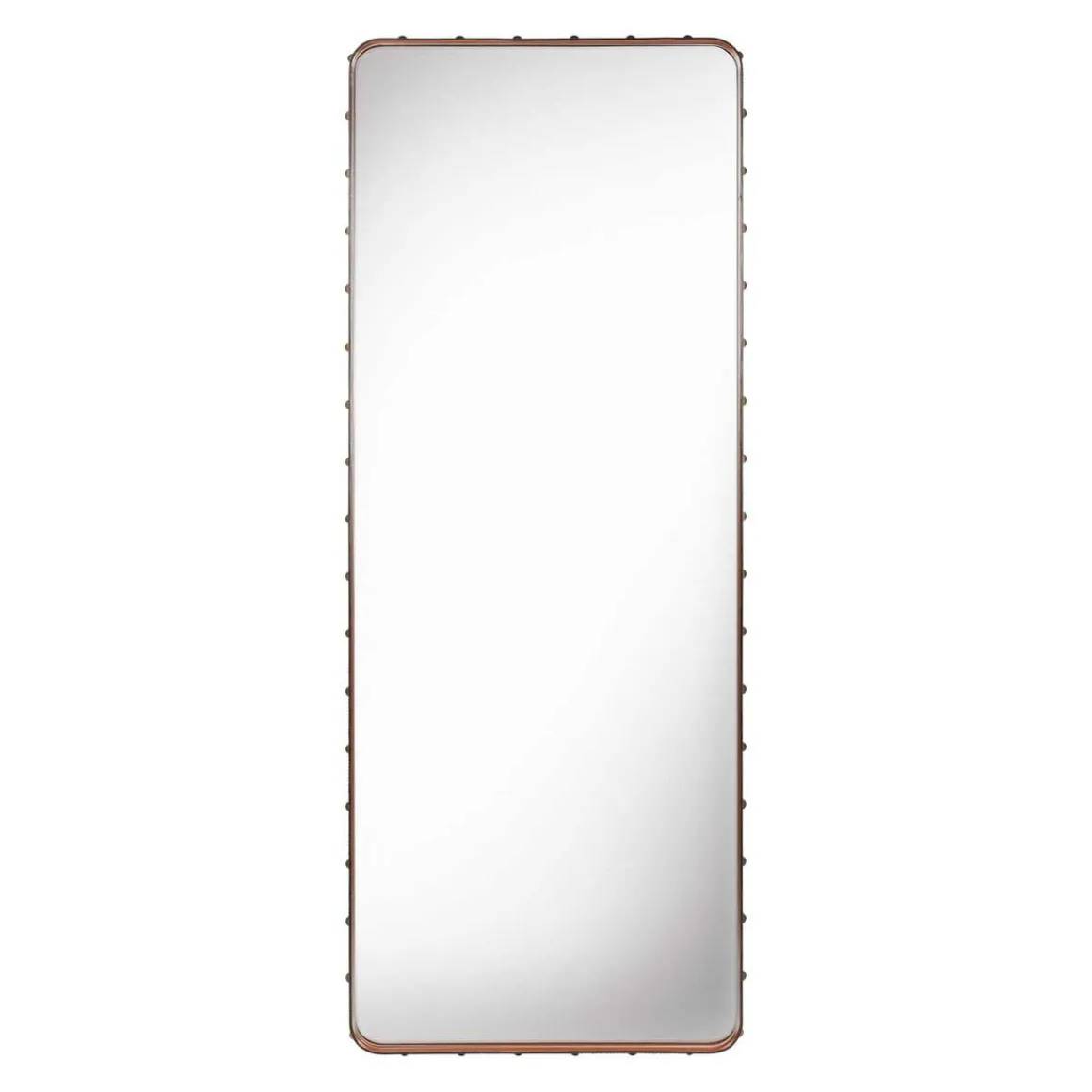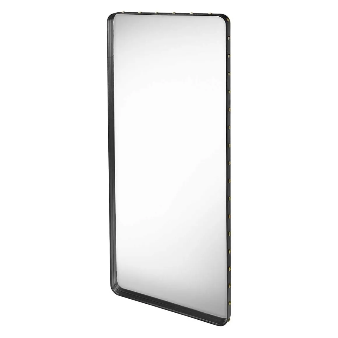 Adnet Miroir Mural Rectangulaire L de Gubi par Jaques Adnet. Le Miroir Rectangulaire Adnet est issu d’un partenariat entre le designer Jaques Adnet et une célèbre maison de couture française dans les années 1950. En appliquant les connaissances de la maison de couture et la haute qualité du cuir à la pensée novatrice et à la vision du design de Jacques Andet, les deux parties ont créé une série de designs intérieurs remarquables. Parmi eux, le miroir rectangulaire en cuir d’Adnet clouté de rivets en laiton bruni sur les bords, un détail caractéristique de l’œuvre d’Adnet.