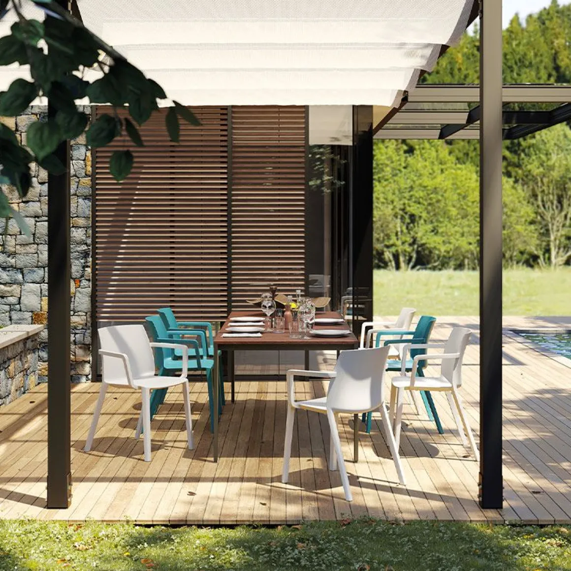 Lorsqu’il n’est pas utilisé, Ador prend peu de place, car il peut être empilé jusqu’à un maximum de 7 chaises. Il est fabriqué en polypropylène chargé de fibres de verre et moulé par injection grâce à l’utilisation de la technologie de moulage à l’air gazeux qui le rend solide et en même temps léger.