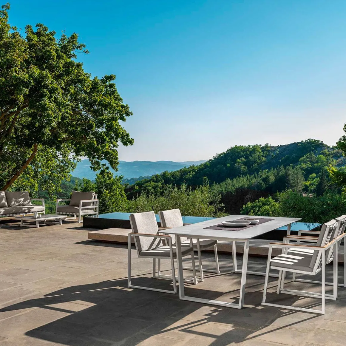 Associant parfaitement aluminium et bois, le fauteuil de repas de la collection AlabamaAlu est simple sans être banal. L’assise confortable en mousse quick dry foam, revêtue de tissu facilement déhoussable et lavable, est soutenue par des sangles élastiques synthétiques, spécialement réalisées pour les extérieurs. Empilable et léger, ce fauteuil est idéal pour compléter une zone repas de jardin.