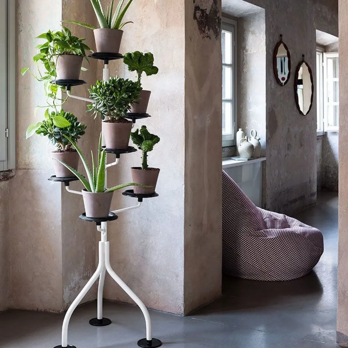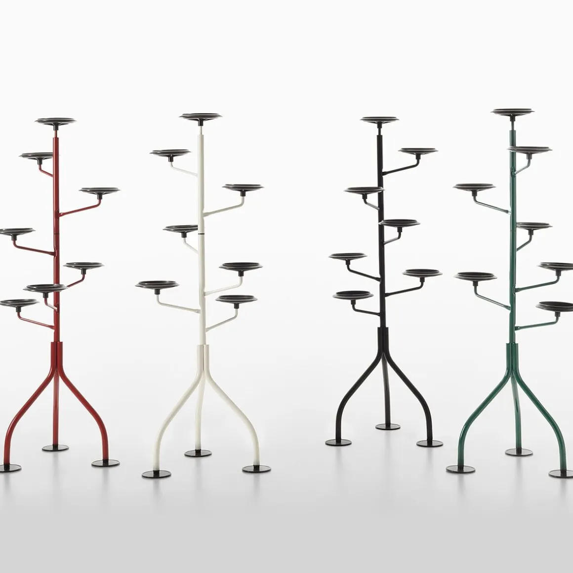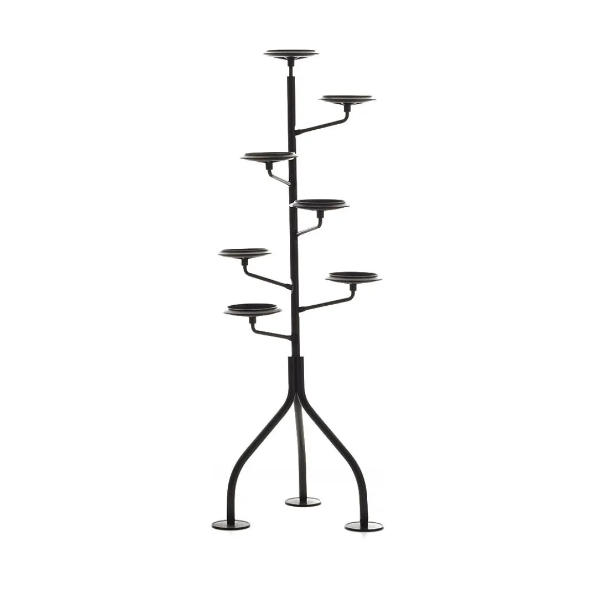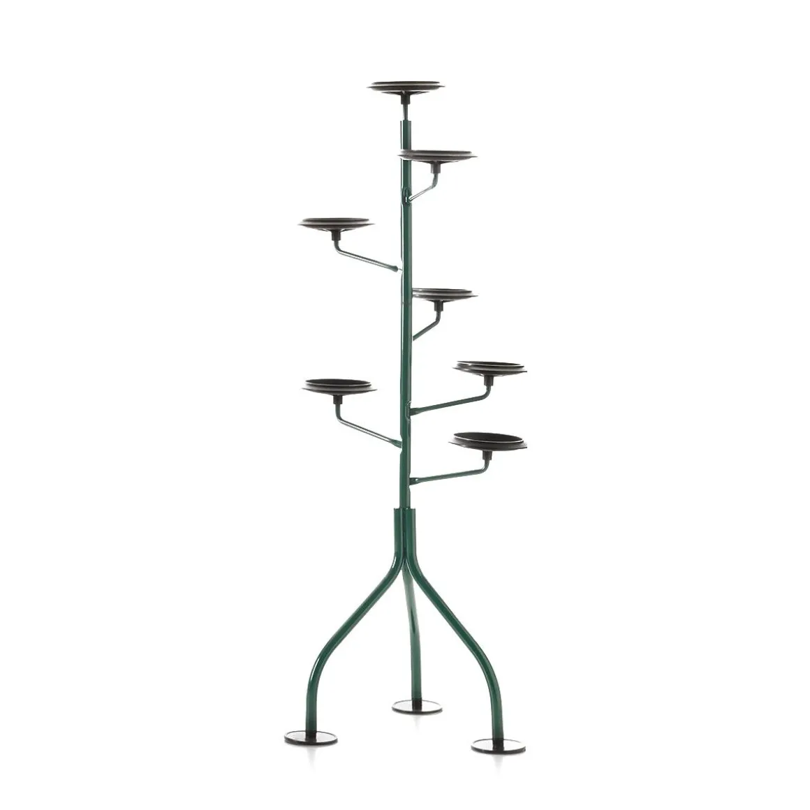 C’est en 1983 qu’Achille Castiglioni a imaginé une présence subtile, dynamique dans sa composition, souple dans sa conception générale articulée, destinée à accueillir des plantes d’intérieur dans leurs propres pots, soutenues par de petites assiettes rondes (comme si elles étaient bienveillantes), exposées régulièrement sur toute la hauteur de la structure. Horizontalement, chaque élément peut être pivoté à 120 degrés. Il est donc préférable d’organiser des plantes de différentes tailles afin de mieux profiter de la lumière du jour sur ce petit «bois vertical» d’intérieur.
