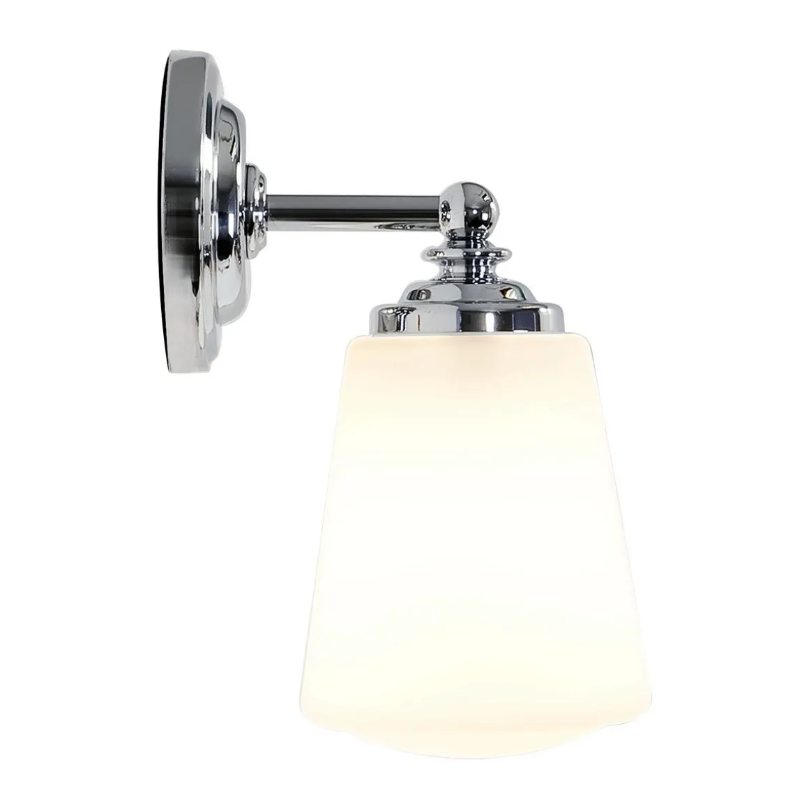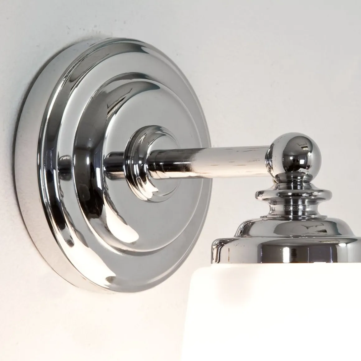 Applique murale Anton de Astro pour la salle de bain. Sa structure est de finition chrome polie et son diffuseur est en verre blanc opalin. Ell est équipée pour une ampoule E14 de 40W maximum.