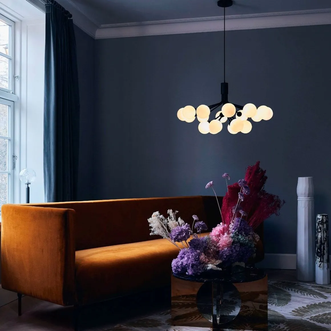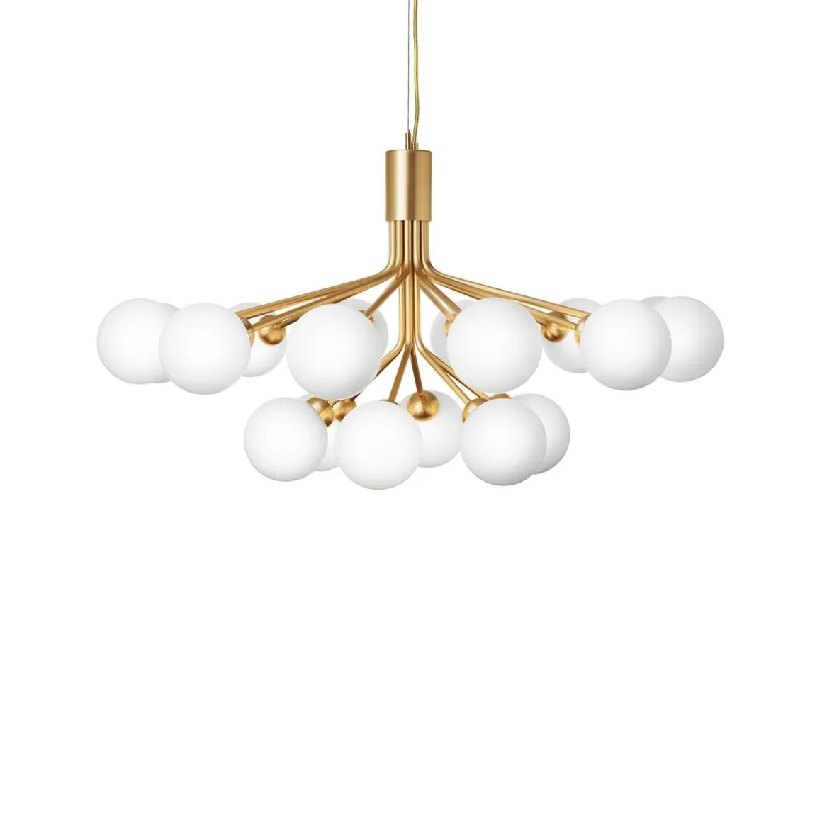 S’inspirant des fleurs, Sofie Refer a conçu la nouvelle collection de lustres, Apiales. La collection se compose de deux lustres avec 9 ou 18 globes en verre soufflé à la bouche et sont disponibles en finition laiton brossé doré ou en noir satiné lisse. D’une verrière spécialement produite, les bras se déploient comme des tiges de fleurs d’où la lumière se diffuse avec grâce. Apiales 18, avec ses 90 cm de diamètre, s’intègre comme pièce maîtresse dans le foyer, un grand salon ou sur une grande table à manger.