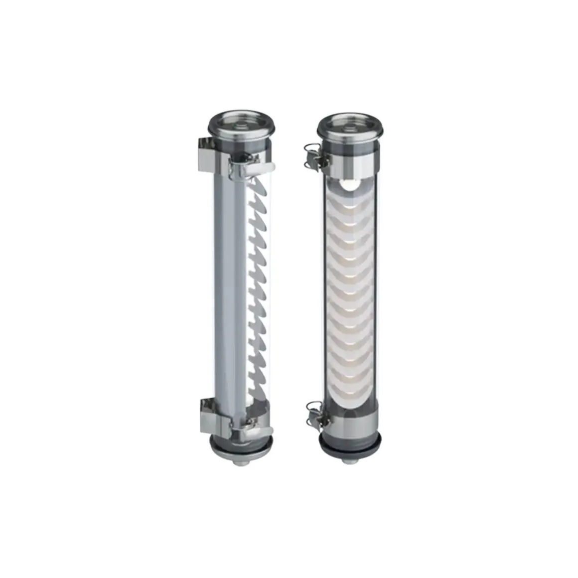 Matériaux : Tube en polycarbonate de qualité cristal, embouts et sangles de fixation en acier inoxydable de qualité marine