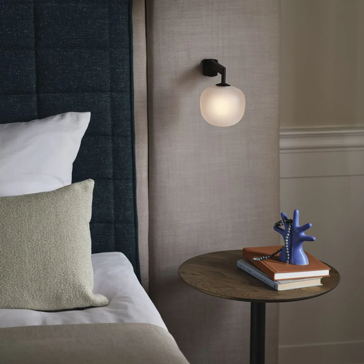 L’applique murale Rime apporte une perspective élégante à la lumière du verre grâce à son verre semi-transparent sablé pour une expression raffinée. Le design présente une forme caractéristique, inspirée de la forme des glands, complétée par la forme géométrique de son bras. L’applique murale Rime dispose d’une source de lumière à intensité variable, permettant à son utilisateur d’ajuster l’intensité lumineuse à ses besoins individuels, que ce soit à la maison, au restaurant ou dans une chambre d’hôtel.