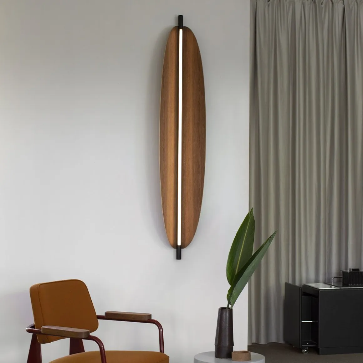 Conçues par Federica Biasi, les appliques et suspensions Thula reposent sur un élément central simple et architectural avec un fonction éclairante à laquelle s’ajoute un composant organique en bois ou en cuir matelassé dans un savant jeu d’addition et de soustraction. Se compose d’une LED linéaire à intensité variable ; dans la version simple murale, il peut être orienté, donnant ainsi une lumière directe ou indirecte.