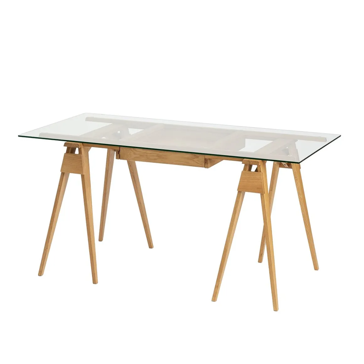 Travailler avec style. Le designer Chuck Mack a créé un bureau soutenu par des tréteaux ; Le plan de travail en verre permet de mettre en valeur tous les objets qui se trouvent dans votre tiroir. La construction peut sembler simple, mais Arco présente plusieurs caractéristiques de conception : le cadre est fixé aux tréteaux par des chevilles en bois pour assurer la stabilité. Le tiroir est accessible des deux côtés de la table, et le plan de travail en verre trempé a des bords lisses et arrondis pour éviter les accidents, et repose sur de petites entretoises en plastique qui le rendent stable. Dans l’ensemble, il est évident qu’Arco a été conçu par un menuisier qualifié.