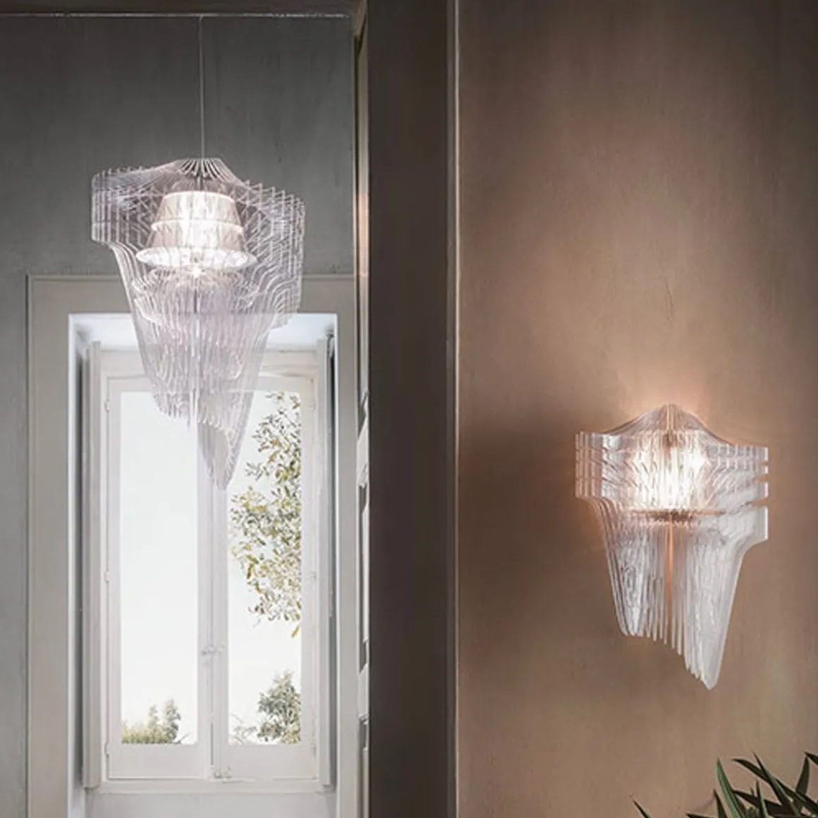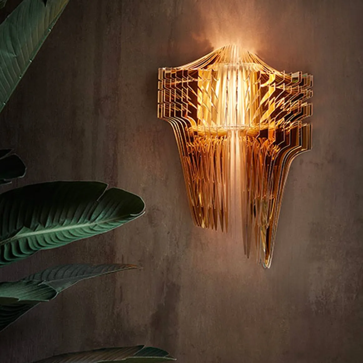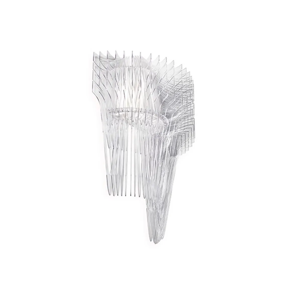 Visionnaires, fluides, dynamiques : les architectures lumineuses conçues par Zaha Hadid transfèrent la sémantique révolutionnaire et iconique de l’archi-star dans des environnements domestiques et réceptifs, harmonisant espace et relations humaines. Les chefs-d’œuvre de Hadid se composent d’une structure radiale composée de 50 couches différentes qui entourent la source lumineuse LED – protégée par un panier qui harmonise esthétiquement la lampe, cachant ses composants électriques – et ils créent un volume tridimensionnel. Dans leur version en applique (25 couches), disponibles dans les deux finitions transparente et dorée, ils projettent des jeux de lumière inattendus sur les murs.
