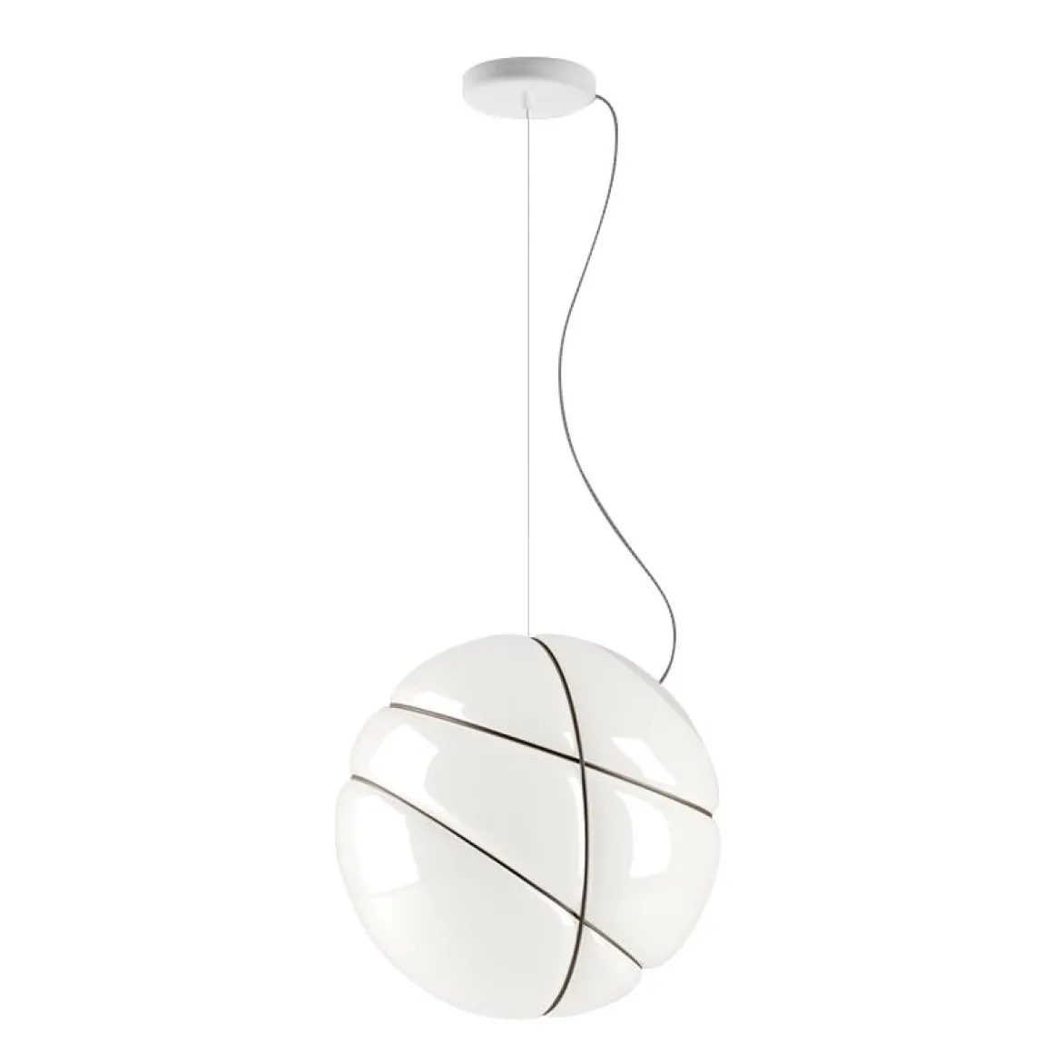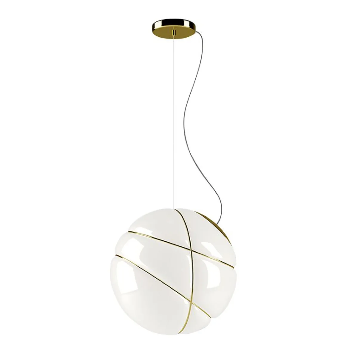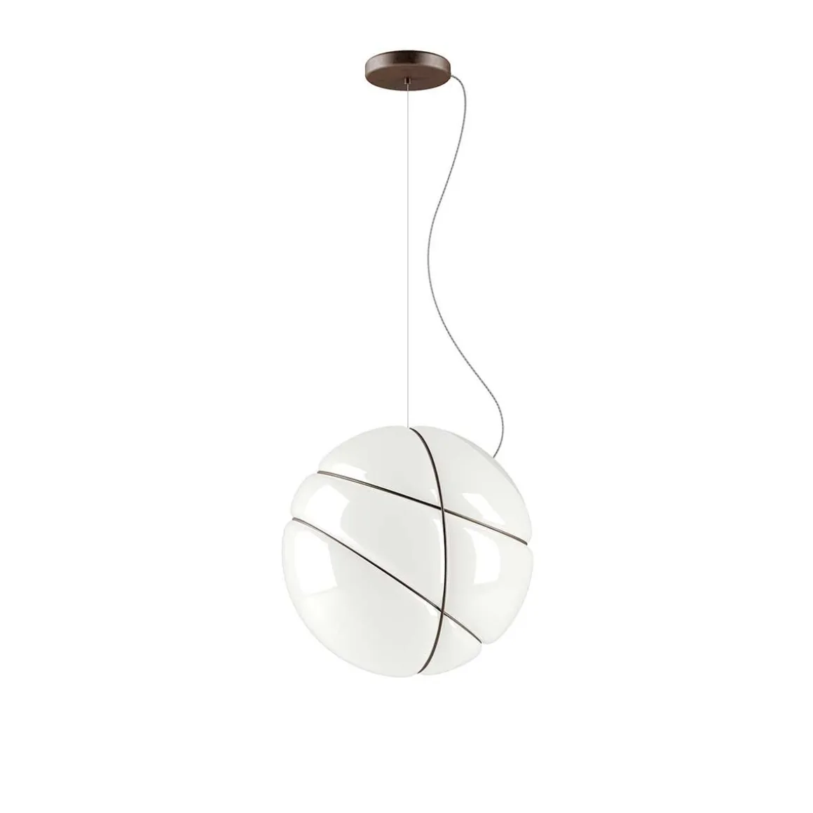 Les cercles d’Armilla se réfèrent à cette habitude ; ils soutiennent la sphère et en exalte la grande masse de verre en opale qui diffuse la lumière depuis la source lumineuse se trouvant au centre de la composition, exactement comme les sphères armillaires imaginées par les cosmographes coperniciens dont les théories étaient héliocentriques. Pour être plus précis, les trois précieux anneaux en métal, opportunément fixés, contiennent le diffuseur, qui grâce à un petit anneau fixé à l’équateur, s’accroche au câble de soutien en métal lui aussi.