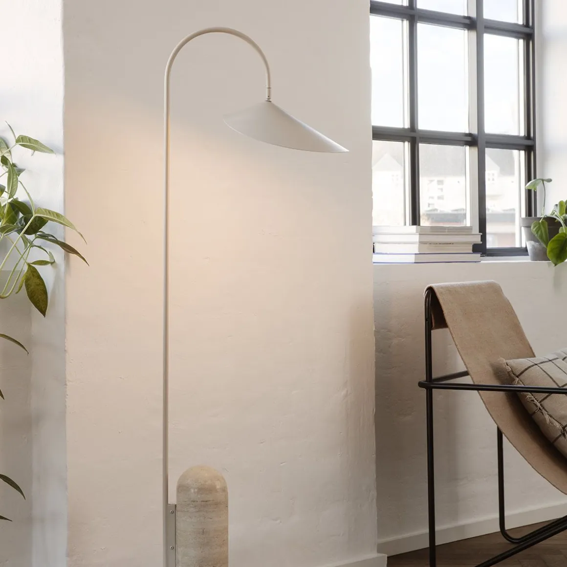 Étude des contrastes, notre lampadaire Arum se distingue par son abat-jour asymétrique qui repose sur une tige métallique élancée et une base en travertin. L’abat-jour incurvé en forme de pétale est peint en blanc sur la face inférieure pour répartir uniformément la lumière douce et ambiante. Utilisez-le pour éclaircir un coin sombre ou placez-le à côté d’une chaise longue pour mettre en lumière un livre préféré, en ajustant l’ombre à l’angle parfait.