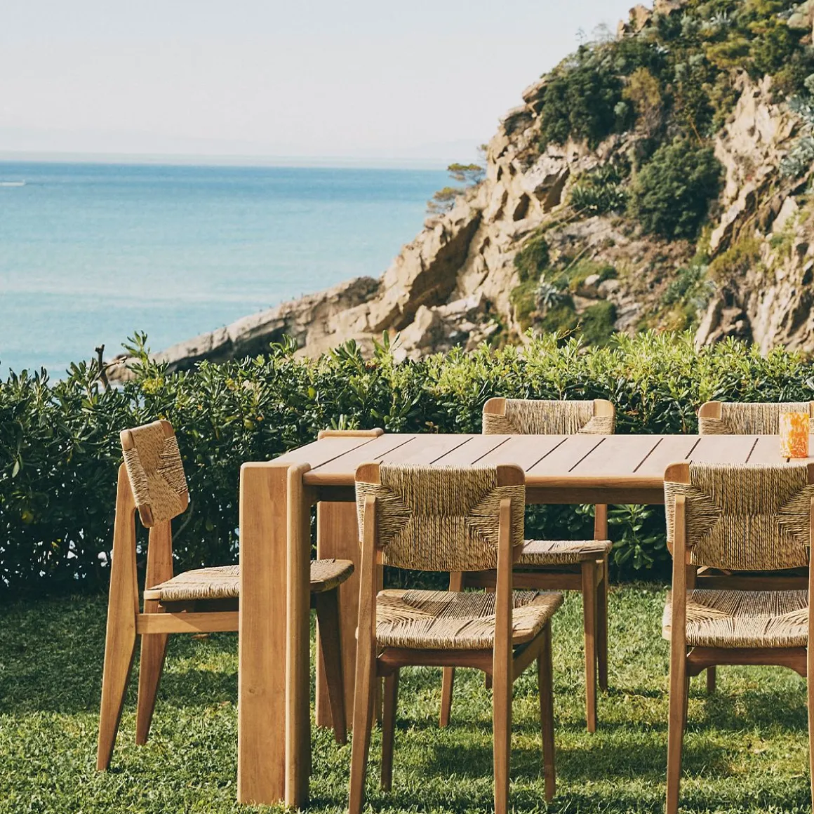 Atmosfera Dining Table de Gubi. L’esthétique simple des tables maintient un équilibre discret avec un clin d’œil aux références classiques sans être trop formel. Les dessus de table sont fabriqués à partir de lattes rythmiques et répétitives de teck massif de qualité supérieure, entourées d’un cadre fabriqué à partir des mêmes lattes, donnant une sensation minimaliste. Les pieds de la table sont formés de deux lattes verticales, à l’aide d’un joint à onglet qui crée une «forme en L» inversée à chaque coin. Faisant référence à la conception architecturale et maritime, la conception inhabituelle des pieds offre à la fois un soutien structurel et un intérêt visuel, conférant à la pièce une certaine légèreté. Chaque pied dépasse légèrement au-dessus de la surface de la table, aboutissant à un détail arrondi contrastant avec les lignes géométriques de la structure, qui donne un calme calme au design.