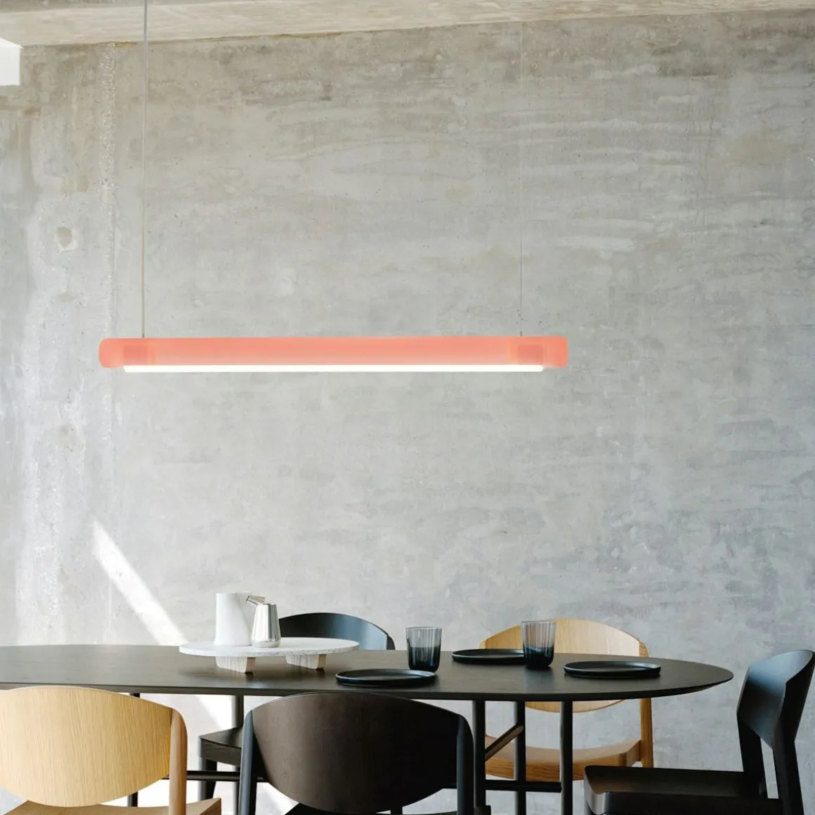 Grâce à l’expertise de Marcelis dans l’utilisation de matériaux translucides moulés, la barre cylindrique suspendue d’Aura Light peut être utilisée seule ou intégrée à un ensemble. Fabriquée à partir de matériaux entièrement recyclablés, l’ampoule sur mesure rehausse la translucidité chaleureuse d’Aura.