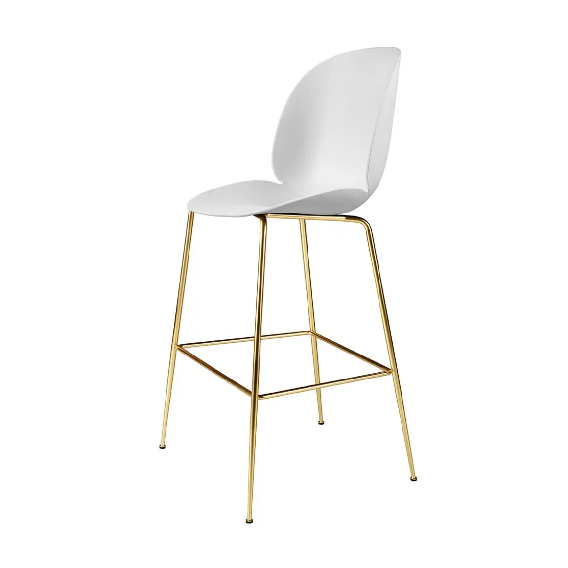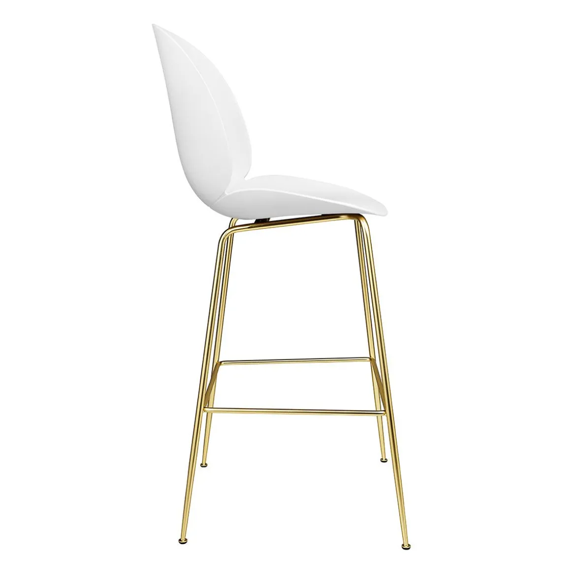 Beetle Bar Chair – Pieds Laiton de Gubi. Avec l’arrivée de la chaise Beetle, la collection s’est dotée d’une série de chaises avec des possibilités illimitées. Le tabouret Beetle n’est plus seulement un tabouret rembourré, mais également disponible avec une coque en plastique de polypropylène, ce qui lui confère une expression plus légère avec une durabilité remarquable à un prix inférieur. La texture subtile et mate du tabouret offre une tactilité douce où son confort de repos exceptionnel est obtenu. Grâce au large éventail d’options de couleurs et de bases, le Beetle Un-upholstered est une solution idéale pour les espaces formels et informels. Mélangez et combinez entre les sept couleurs harmonieuses pour créer une expression personnelle.