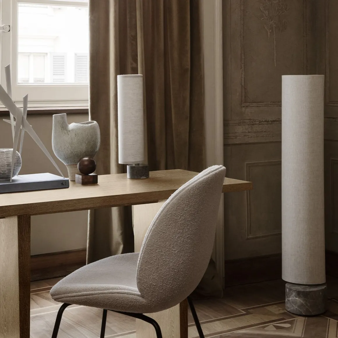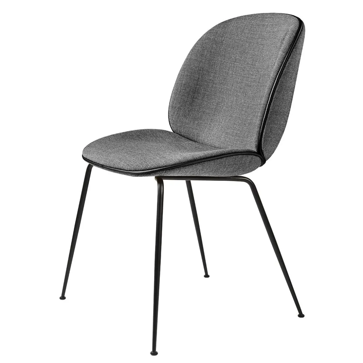 Beetle Chair Rembourré de Gubi. La collection d’assises Beetle est une série de chaises en placage moulé stratifié avec le siège et le dos en 2 parties séparées. Les 2 parties sont assemblées avec un raccord en acier fraisé dans les 2 coques. Les coquilles ont une épaisseur de 10 mm. La chaise est toujours entièrement rembourrée en tissu.