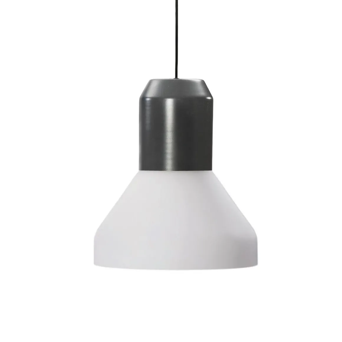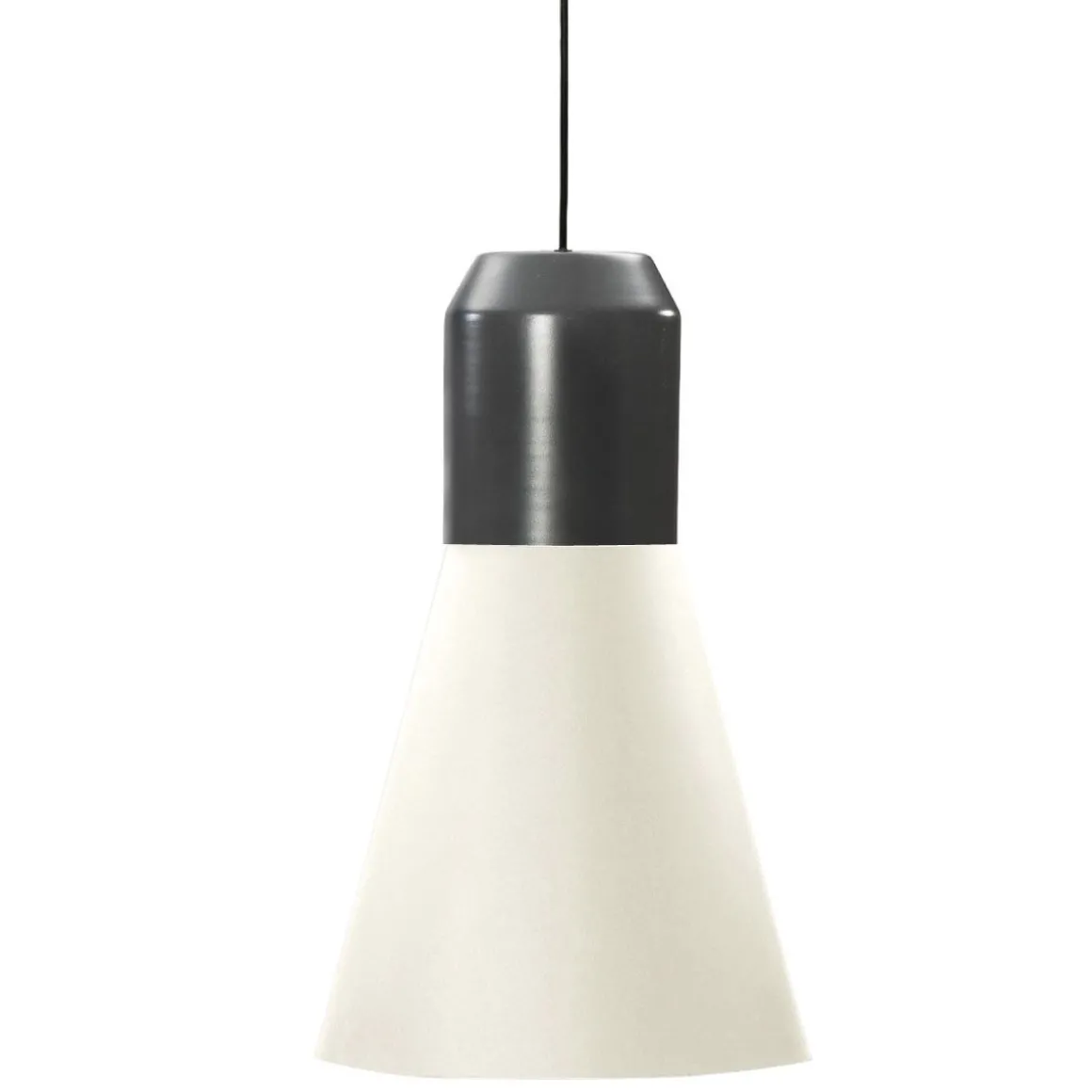 Chaque abat-jour de cette famille de lampes suspendues peut être combiné à volonté avec les douilles épurées de forme cylindrique et de couleur gris, laiton ou cuivre.