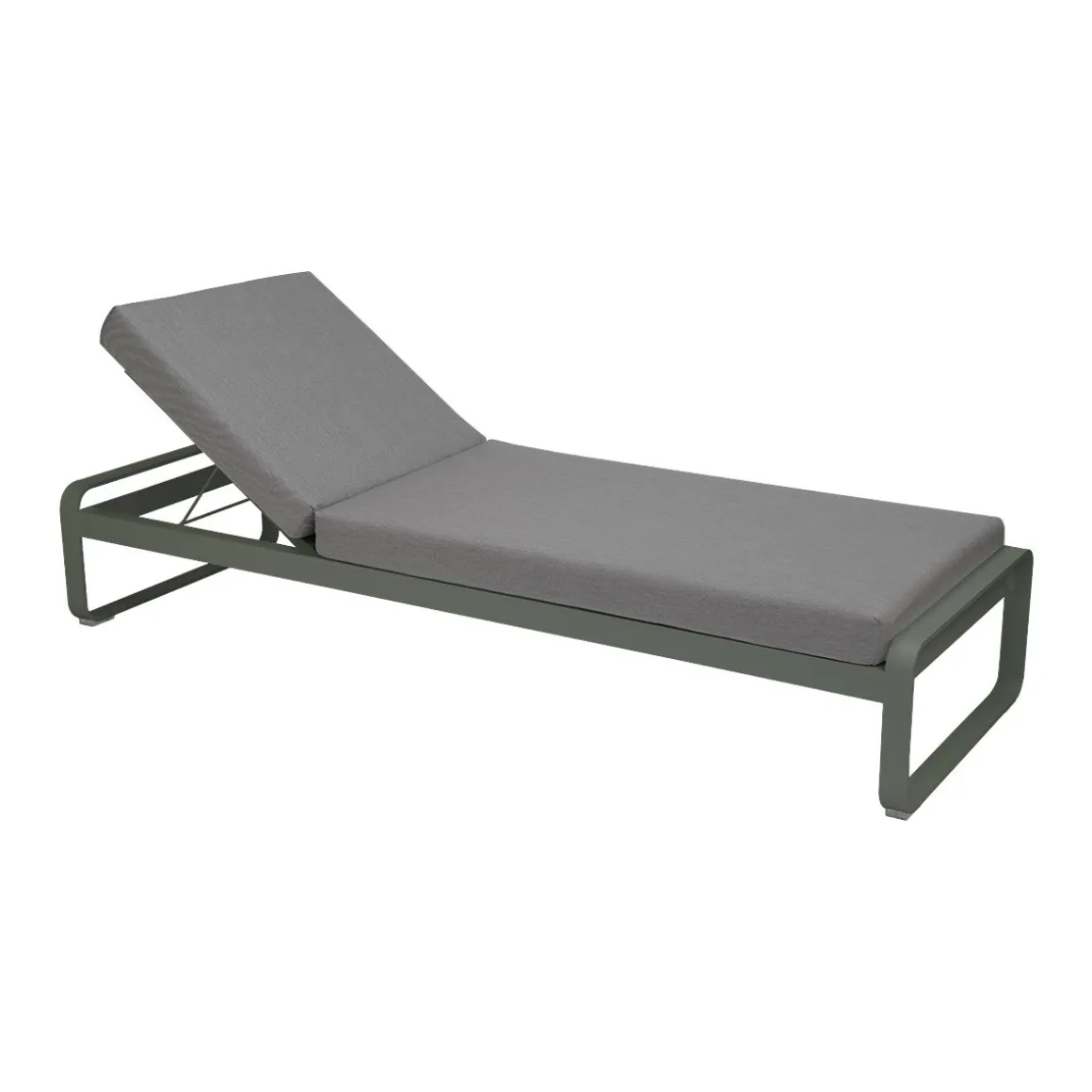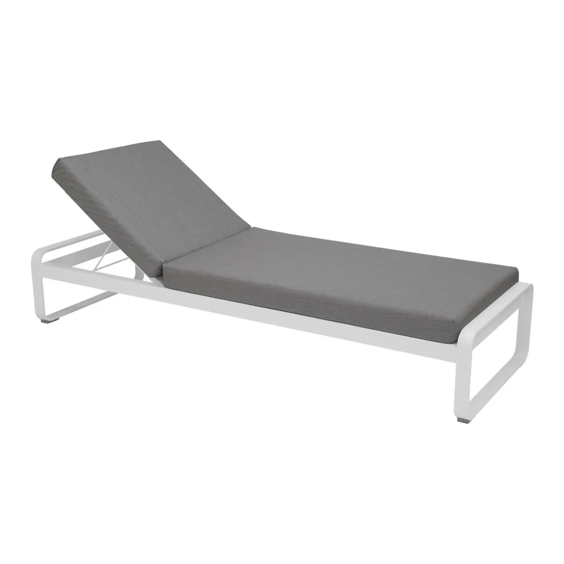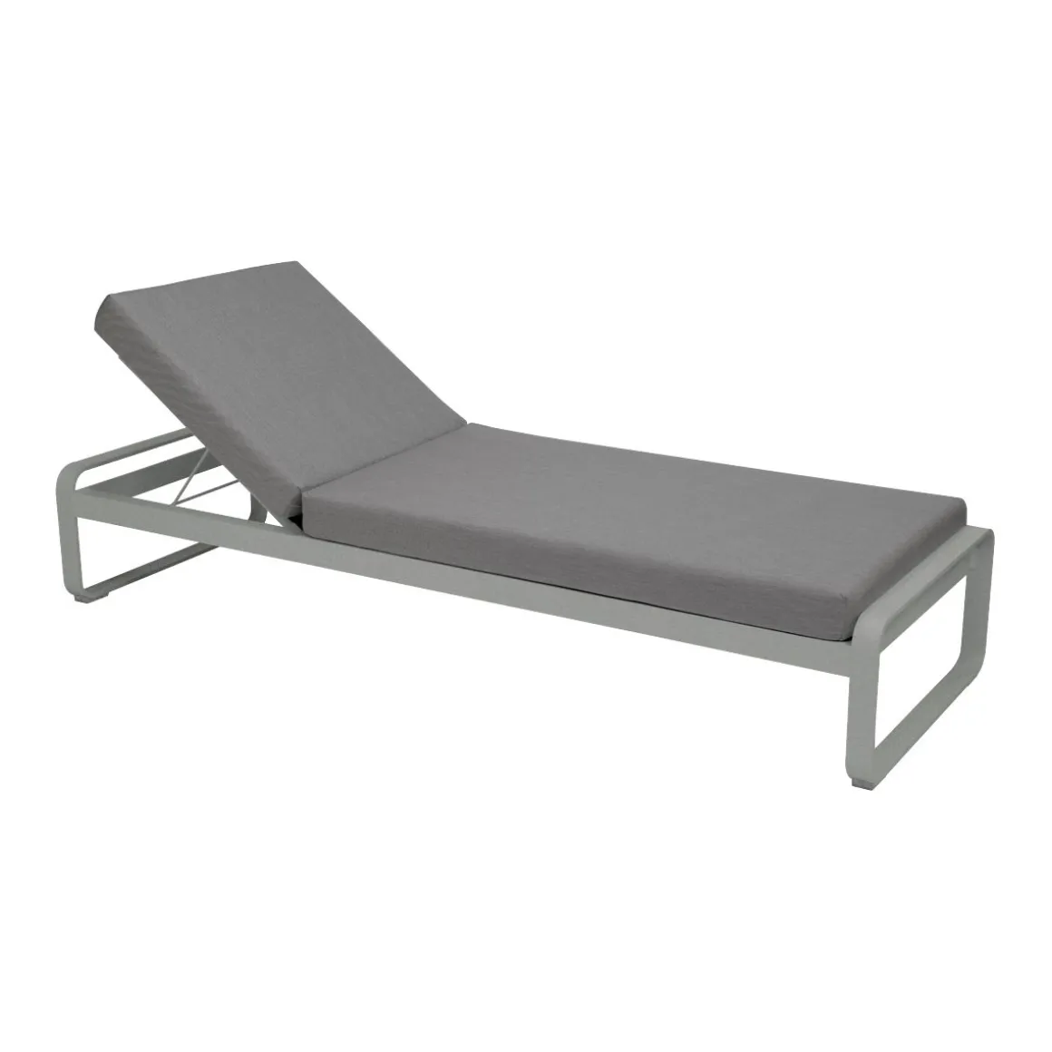 Bellevie lit de soleil – Gris flanelle de Fermob. Avec Fermob, la vie est belle, tout autour de vous - dans votre coin repas, dans votre espace lounge, en outdoor comme en indoor, et même au bord de votre piscine…. Avec son lit de soleil Bellevie, signé du studio de design Pagnon et Pelhaître, la marque convoque sous nos yeux cette dolce vita. Et elle élève les standards de la chaise longue à des niveaux jamais atteints. Comment ne pas s’imaginer, allongé, à la belle saison, sous le soleil exactement ? Pour une sieste voluptueuse, au sortir de l’eau de la piscine, en été. Projetez-vous aussi, feuilletant un magazine ou tout simplement, contemplant le vent qui fait bouger les rameaux d’olivier. Ce bain de soleil aux courbes très douces, à l’image de toute la collection Bellevie, offre trois réglages, dont l’un, à plat, afin de piquer du nez. Si vous souhaitez juste vous reposer ou papoter, remontez le dossier de votre transat premium. Et enfin, pour siroter votre cocktail ou lire un roman, redressez-le encore d’un cran. Savourez aussi le confort de son matelas en mousse polyuréthane haute résilience, articulé, et déhoussable afin de pouvoir laver sa housse en machine. Et appréciez la douceur de son tissu Sunbrella®, revêtement outdoor 100% acrylique teint masse, résistant aux taches, à la moisissure, aux déchirures et à l’abrasion. La structure 100% aluminium, de votre bain de soleil haut de gamme est elle aussi ultra-durable, résistante à toute épreuve, même en bord de mer. Petit détail astucieux et hyper appréciable : une grille anti-glisse sous le matelas de votre chaise longue permet de le maintenir bien en place sur sa structure et évite qu’il ne glisse. Cette chaise longue de fabrication française vous promet des heures de bonheur, sur la terrasse de votre piscine. Fermez les yeux et laissez-vous aller… Projetez-vous sur ce bain de soleil et, pour optimiser encore plus son confort, équipez-vous de l’appui-tête de la même collection, spécialement conçu pour s’accrocher au matelas.