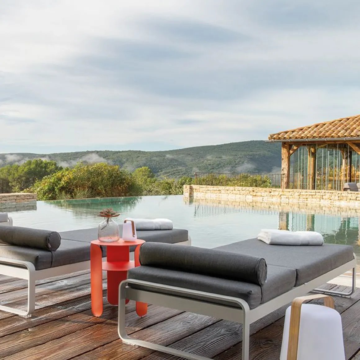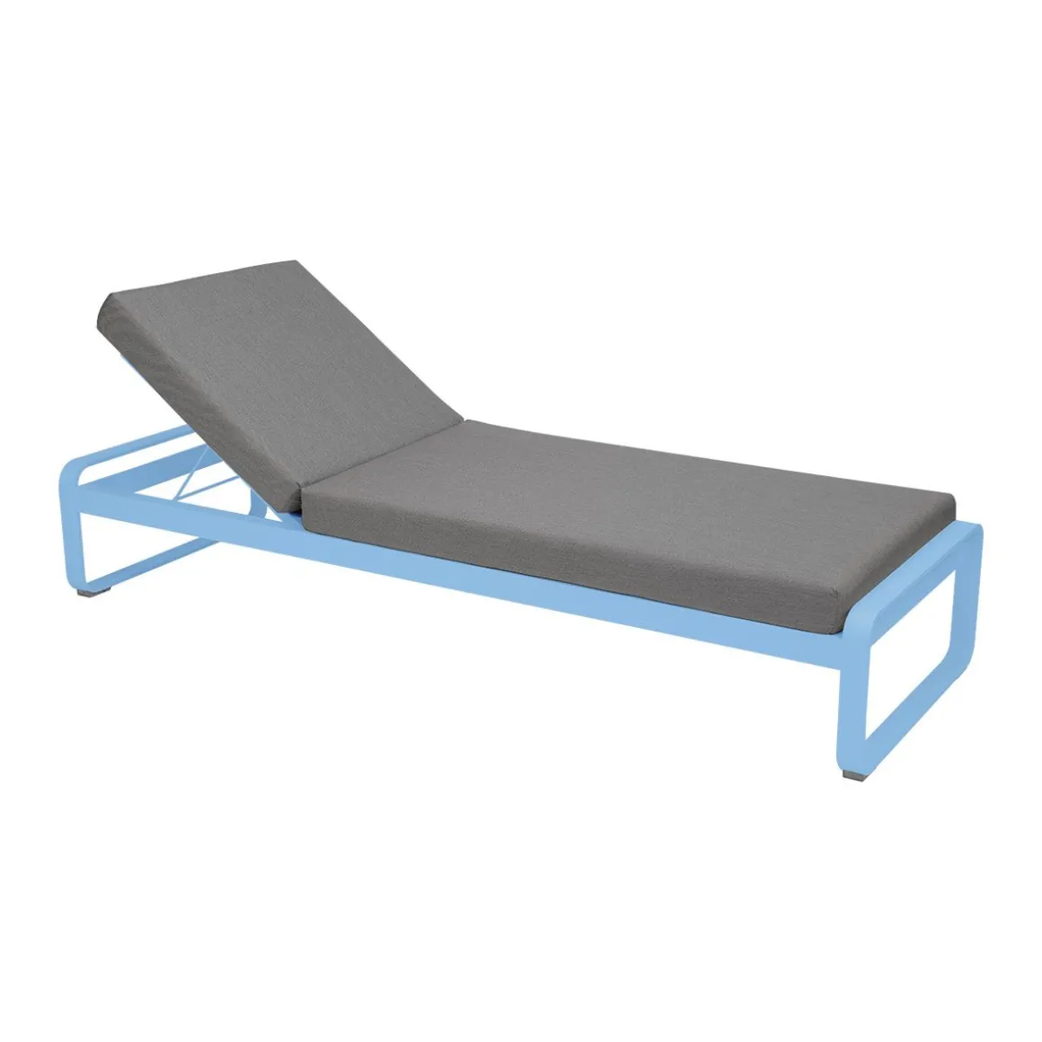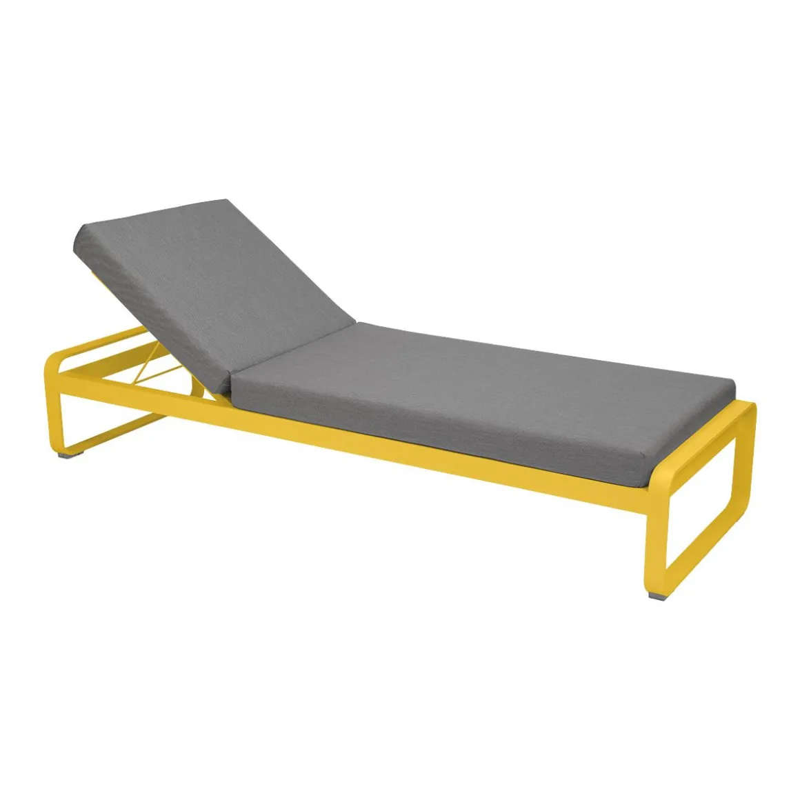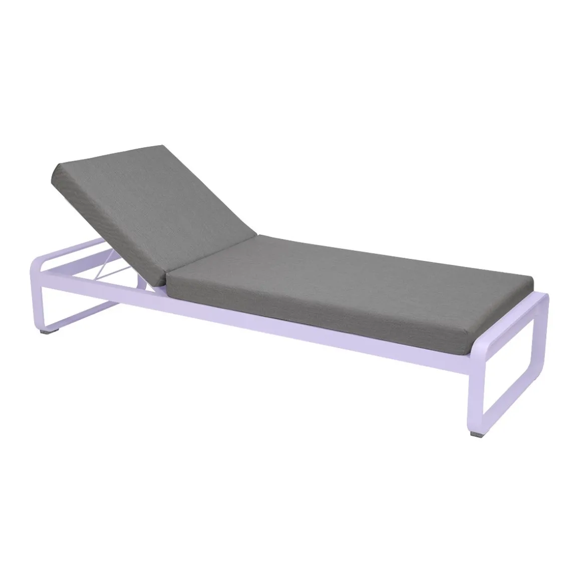Bellevie lit de soleil – Gris flanelle de Fermob. Avec Fermob, la vie est belle, tout autour de vous - dans votre coin repas, dans votre espace lounge, en outdoor comme en indoor, et même au bord de votre piscine…. Avec son lit de soleil Bellevie, signé du studio de design Pagnon et Pelhaître, la marque convoque sous nos yeux cette dolce vita. Et elle élève les standards de la chaise longue à des niveaux jamais atteints. Comment ne pas s’imaginer, allongé, à la belle saison, sous le soleil exactement ? Pour une sieste voluptueuse, au sortir de l’eau de la piscine, en été. Projetez-vous aussi, feuilletant un magazine ou tout simplement, contemplant le vent qui fait bouger les rameaux d’olivier. Ce bain de soleil aux courbes très douces, à l’image de toute la collection Bellevie, offre trois réglages, dont l’un, à plat, afin de piquer du nez. Si vous souhaitez juste vous reposer ou papoter, remontez le dossier de votre transat premium. Et enfin, pour siroter votre cocktail ou lire un roman, redressez-le encore d’un cran. Savourez aussi le confort de son matelas en mousse polyuréthane haute résilience, articulé, et déhoussable afin de pouvoir laver sa housse en machine. Et appréciez la douceur de son tissu Sunbrella®, revêtement outdoor 100% acrylique teint masse, résistant aux taches, à la moisissure, aux déchirures et à l’abrasion. La structure 100% aluminium, de votre bain de soleil haut de gamme est elle aussi ultra-durable, résistante à toute épreuve, même en bord de mer. Petit détail astucieux et hyper appréciable : une grille anti-glisse sous le matelas de votre chaise longue permet de le maintenir bien en place sur sa structure et évite qu’il ne glisse. Cette chaise longue de fabrication française vous promet des heures de bonheur, sur la terrasse de votre piscine. Fermez les yeux et laissez-vous aller… Projetez-vous sur ce bain de soleil et, pour optimiser encore plus son confort, équipez-vous de l’appui-tête de la même collection, spécialement conçu pour s’accrocher au matelas.