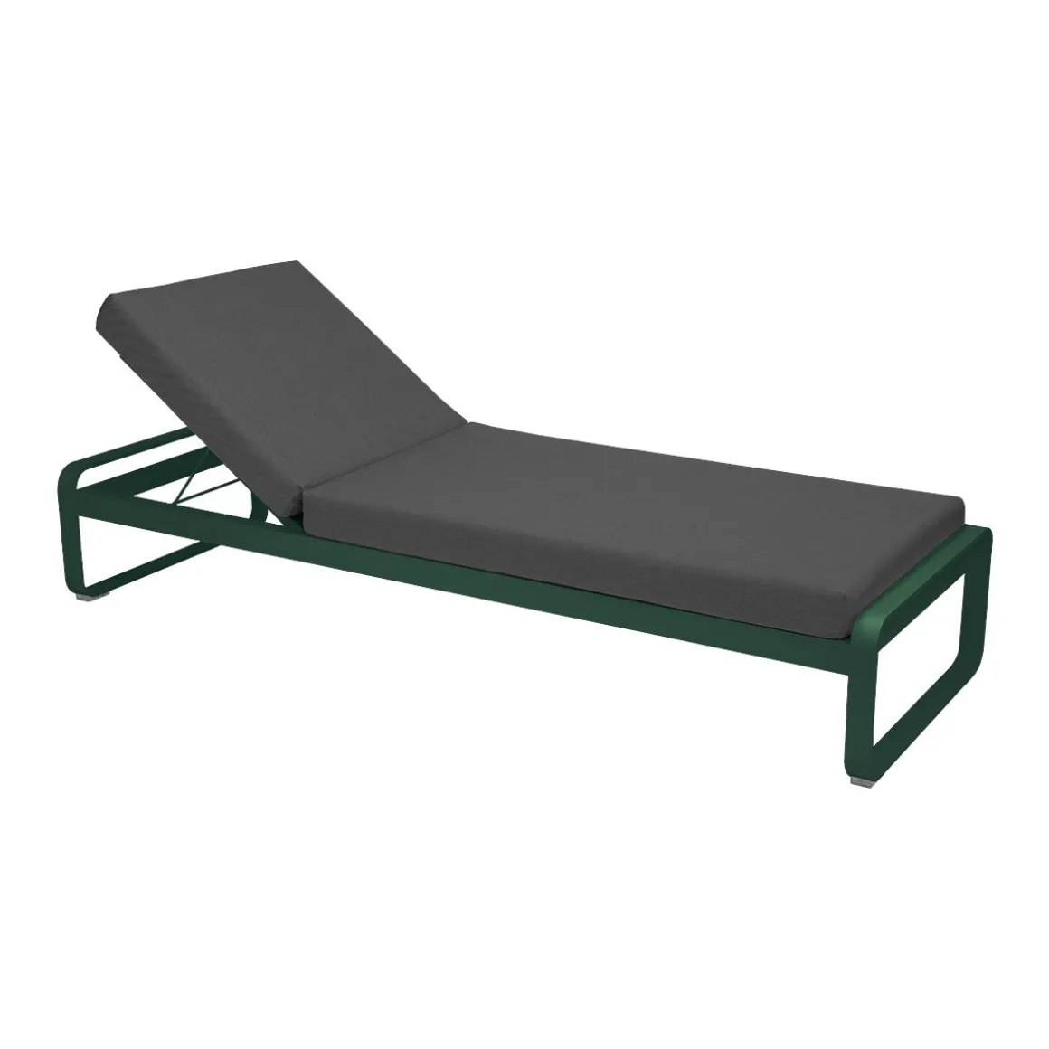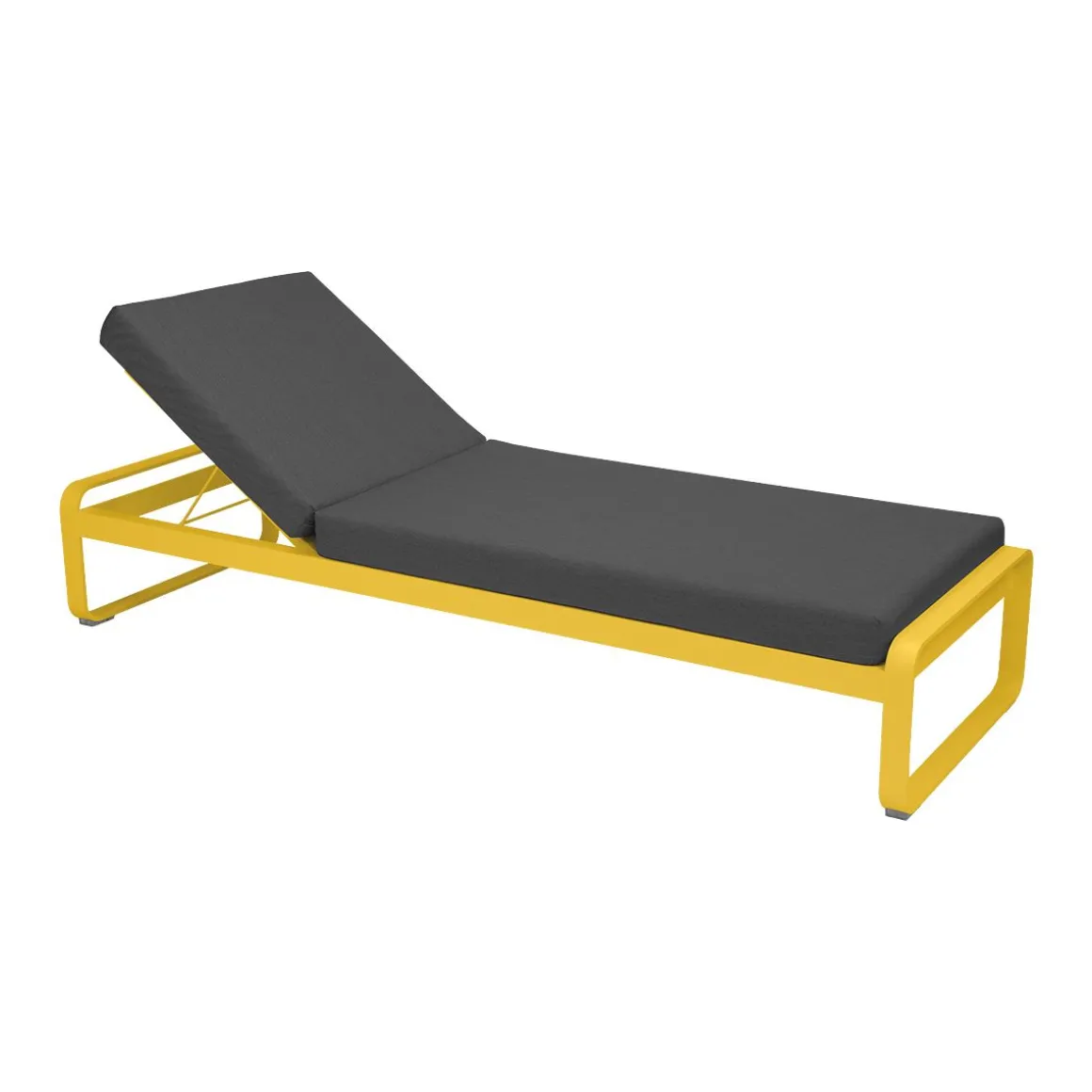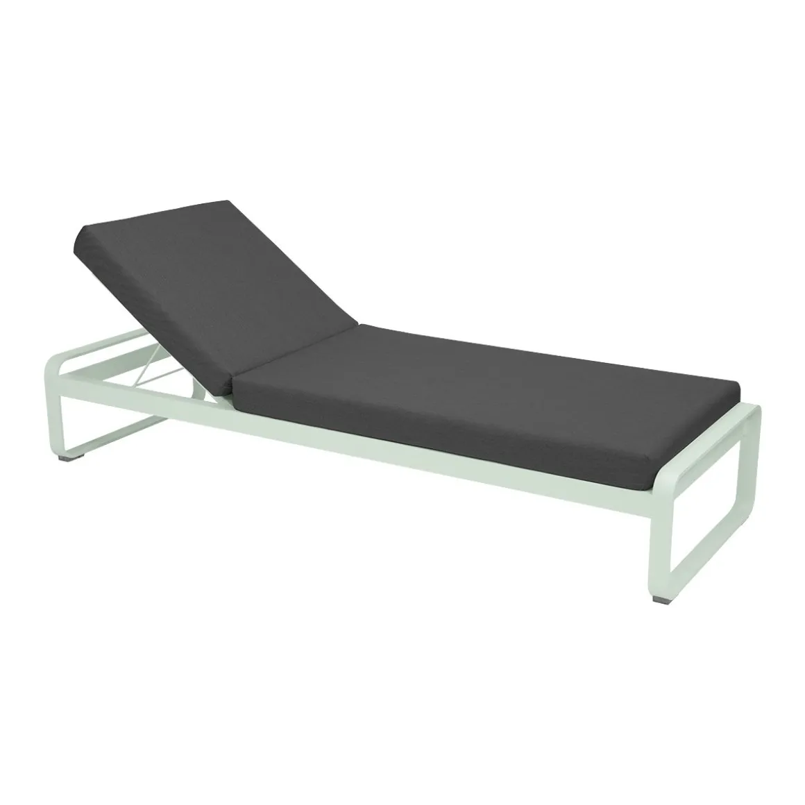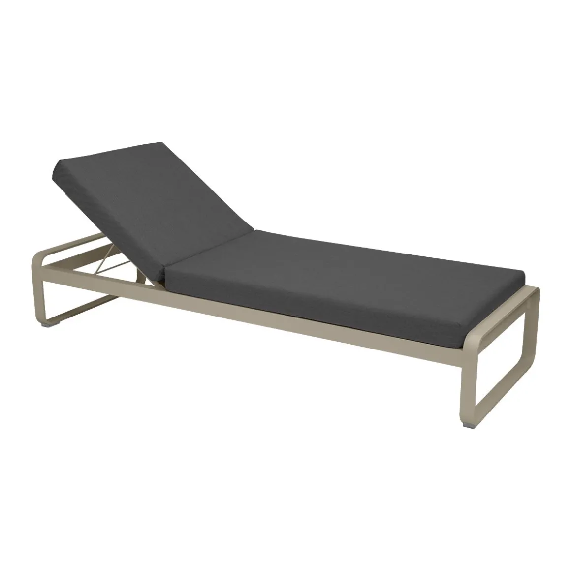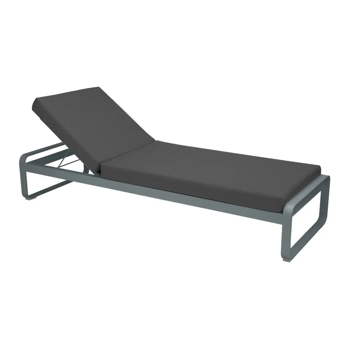 Bellevie lit de soleil – Gris graphite de Fermob. Avec Fermob, la vie est belle, tout autour de vous - dans votre coin repas, dans votre espace lounge, en outdoor comme en indoor, et même au bord de votre piscine…. Avec son lit de soleil Bellevie, signé du studio de design Pagnon et Pelhaître, la marque convoque sous nos yeux cette dolce vita. Et elle élève les standards de la chaise longue à des niveaux jamais atteints. Comment ne pas s’imaginer, allongé, à la belle saison, sous le soleil exactement ? Pour une sieste voluptueuse, au sortir de l’eau de la piscine, en été. Projetez-vous aussi, feuilletant un magazine ou tout simplement, contemplant le vent qui fait bouger les rameaux d’olivier. Ce bain de soleil aux courbes très douces, à l’image de toute la collection Bellevie, offre trois réglages, dont l’un, à plat, afin de piquer du nez. Si vous souhaitez juste vous reposer ou papoter, remontez le dossier de votre transat premium. Et enfin, pour siroter votre cocktail ou lire un roman, redressez-le encore d’un cran. Savourez aussi le confort de son matelas en mousse polyuréthane haute résilience, articulé, et déhoussable afin de pouvoir laver sa housse en machine. Et appréciez la douceur de son tissu Sunbrella®, revêtement outdoor 100% acrylique teint masse, résistant aux taches, à la moisissure, aux déchirures et à l’abrasion. La structure 100% aluminium, de votre bain de soleil haut de gamme est elle aussi ultra-durable, résistante à toute épreuve, même en bord de mer. Petit détail astucieux et hyper appréciable : une grille anti-glisse sous le matelas de votre chaise longue permet de le maintenir bien en place sur sa structure et évite qu’il ne glisse. Cette chaise longue de fabrication française vous promet des heures de bonheur, sur la terrasse de votre piscine. Fermez les yeux et laissez-vous aller… Projetez-vous sur ce bain de soleil et, pour optimiser encore plus son confort, équipez-vous de l’appui-tête de la même collection, spécialement conçu pour s’accrocher au matelas.