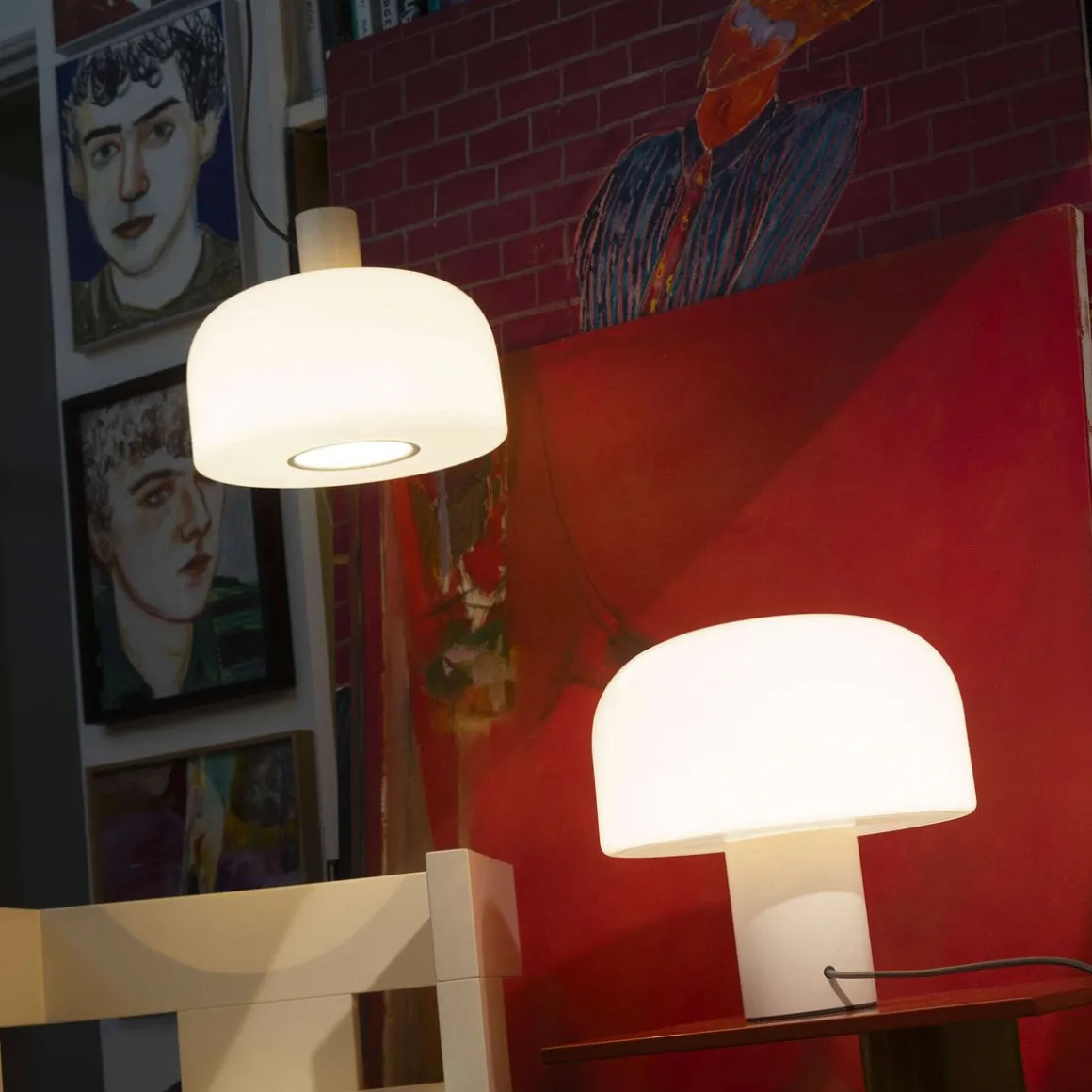 La suspension Bellhop Glass peut être utilisée comme lampe d’ambiance mais aussi comme lampe de travail, qui éclaire directement, avec un cône de lumière non aveuglant, la surface sur laquelle elle est suspendue. Le trou dans la partie inférieure de la lampe, protégé par un élément en aluminium, est façonné pour diriger la lumière (et changer l’ampoule) en évitant la diffusion jusqu’aux yeux de ceux qui sont assis à la table. Un cône de lumière est donc créé à l’intérieur de la suspension Bellhop Glass, qui se dilate de manière homogène dans l’environnement sur tous les côtés et se pose précisément sur la table, comme une torche, signalée visuellement par l’anneau en aluminium coloré qui entoure l’ouverture inférieure de la lampe.